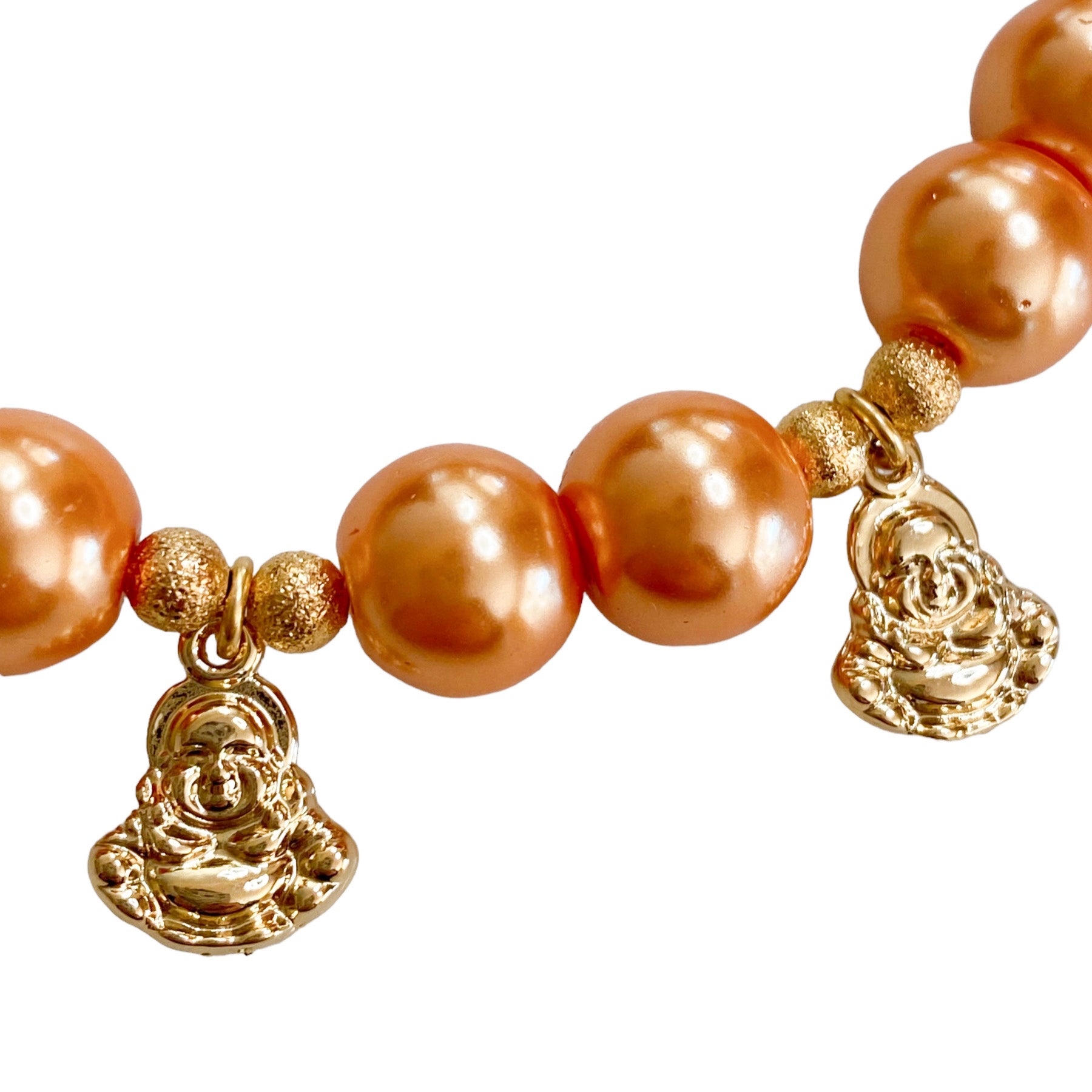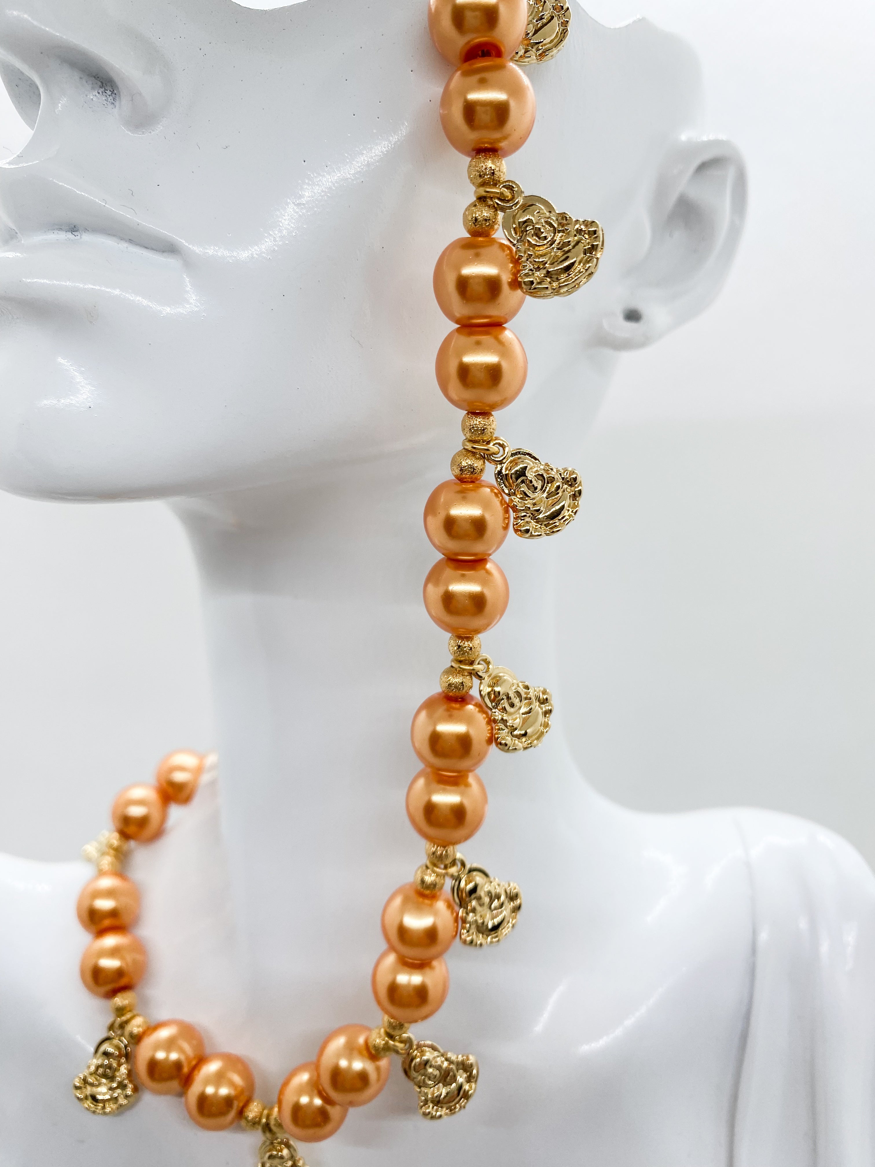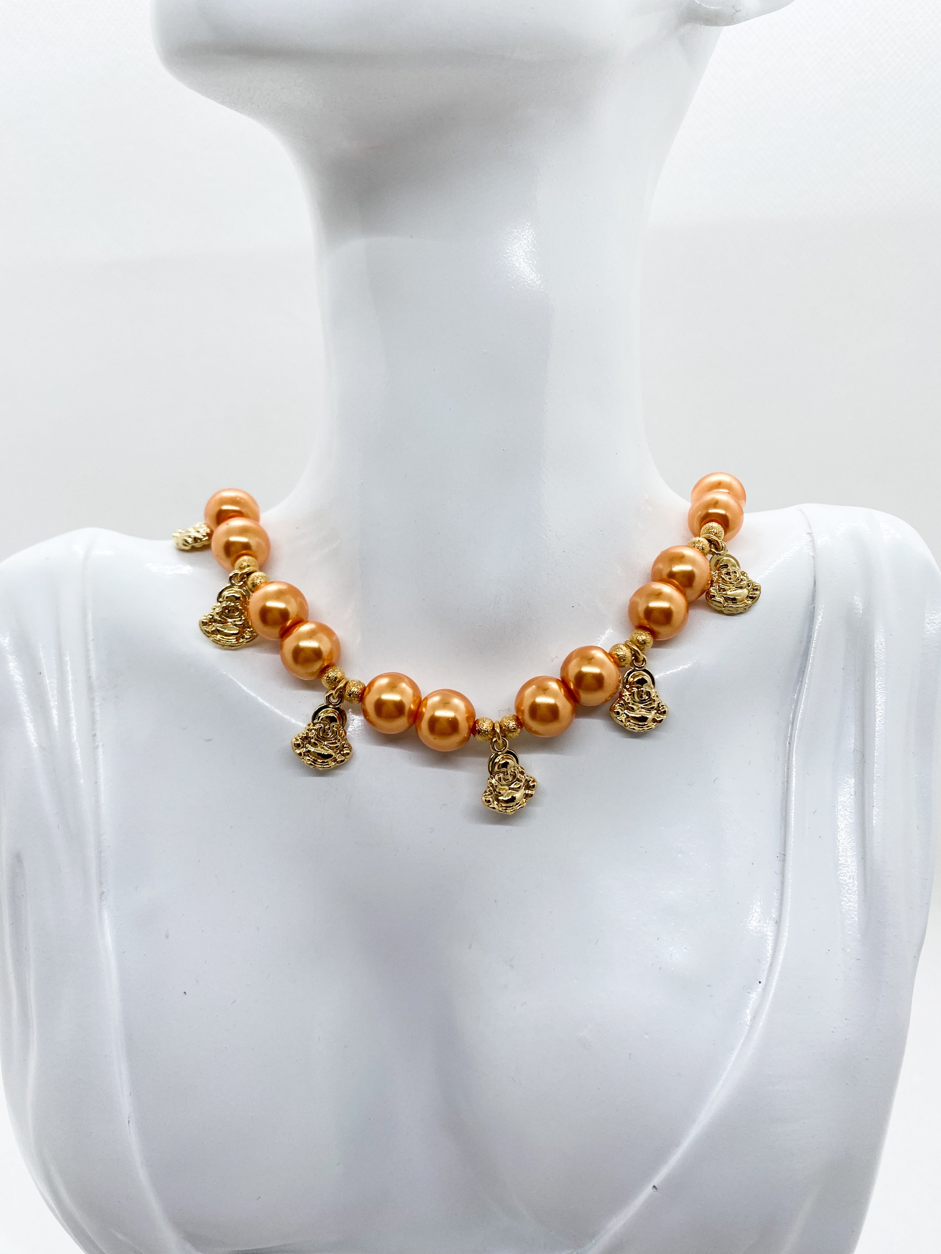 Collier composé de 26 perles de verre oranges d’1 cm de diamètre, de 26 perles diamantées de 4mm de diamètre dorées à l’or fin 24K 1 micron, de minis pendentifs représentant Buddha dorés à l’or fin 24K 1 micron et d’une chaînette d’extension de 10 cm dorée à l’or fin 24K revêtement cataphorèse.