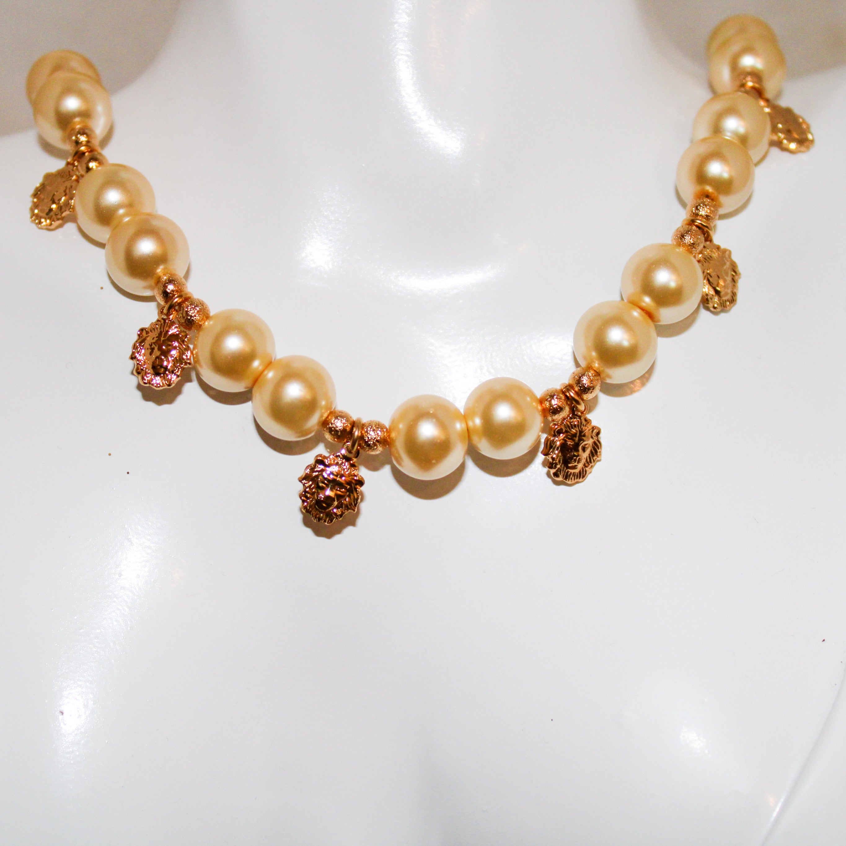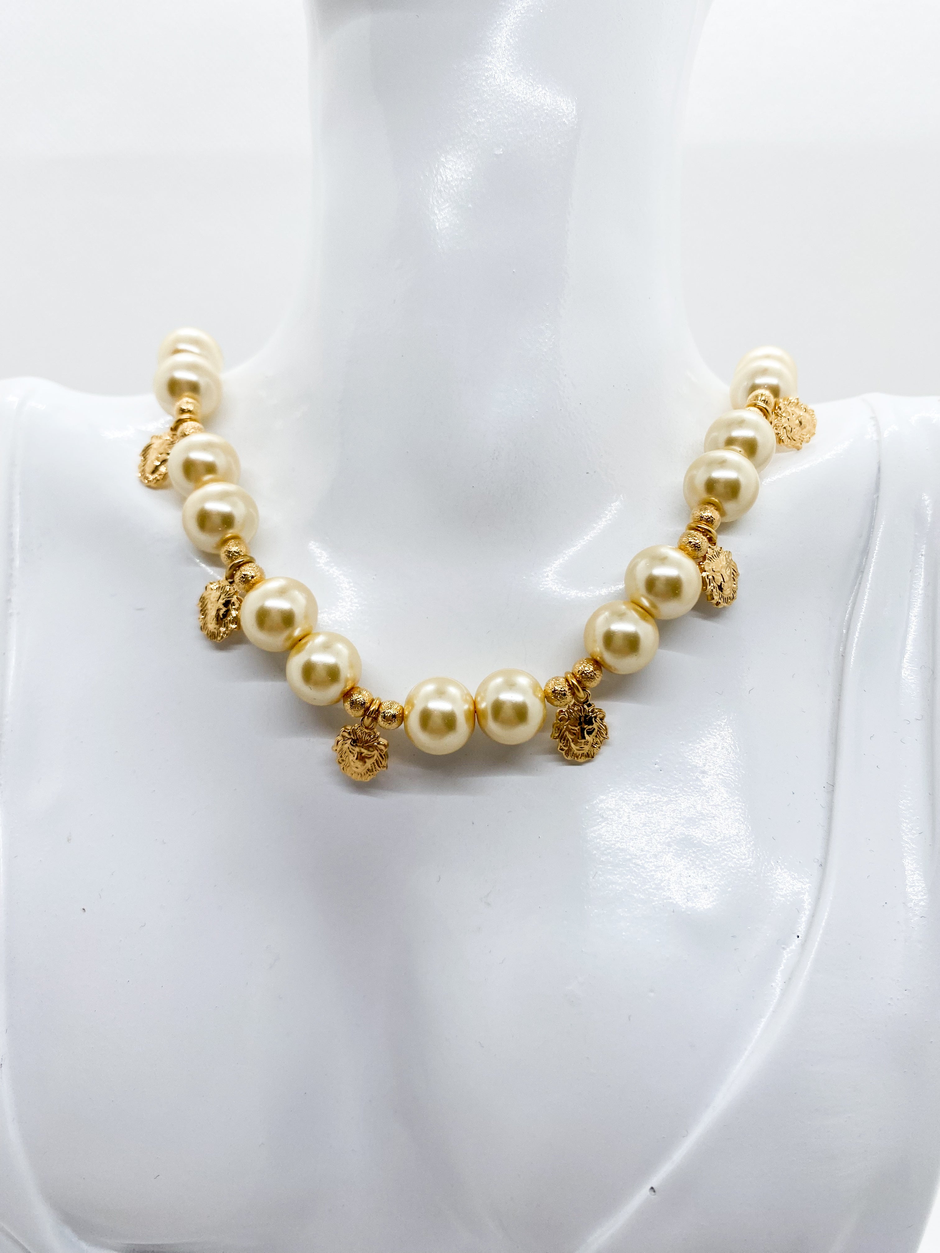 Collier composé de 26 perles de verre jaunes d’1 cm de diamètre, de 26 perles diamantées de 4mm de diamètre dorées à l’or fin 24K 1 micron, de minis pendentifs représentant un lion dorés à l’or fin 24K 1 micron et d’une chaînette d’extension de 10 cm dorée à l’or fin 24K revêtement cataphorèse.