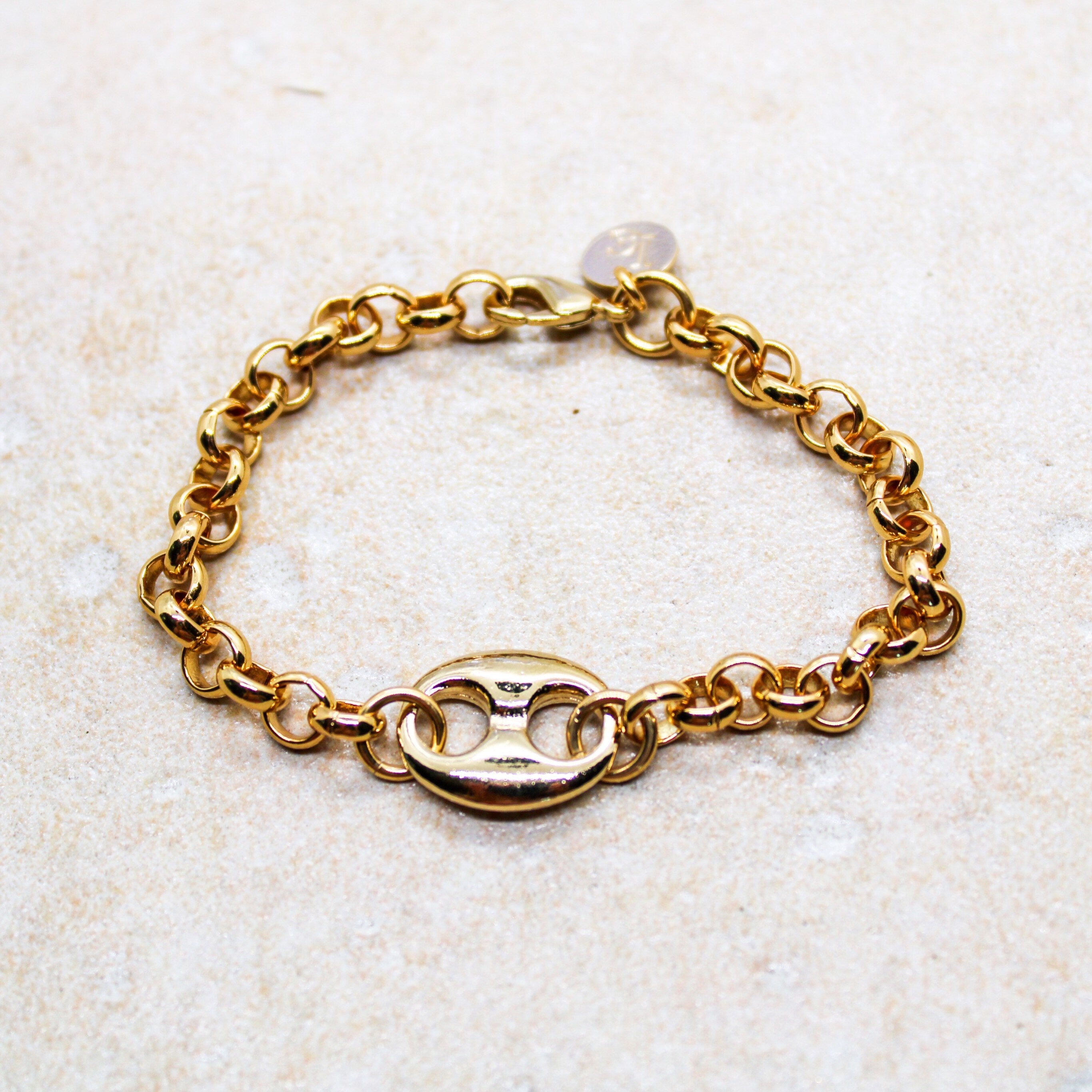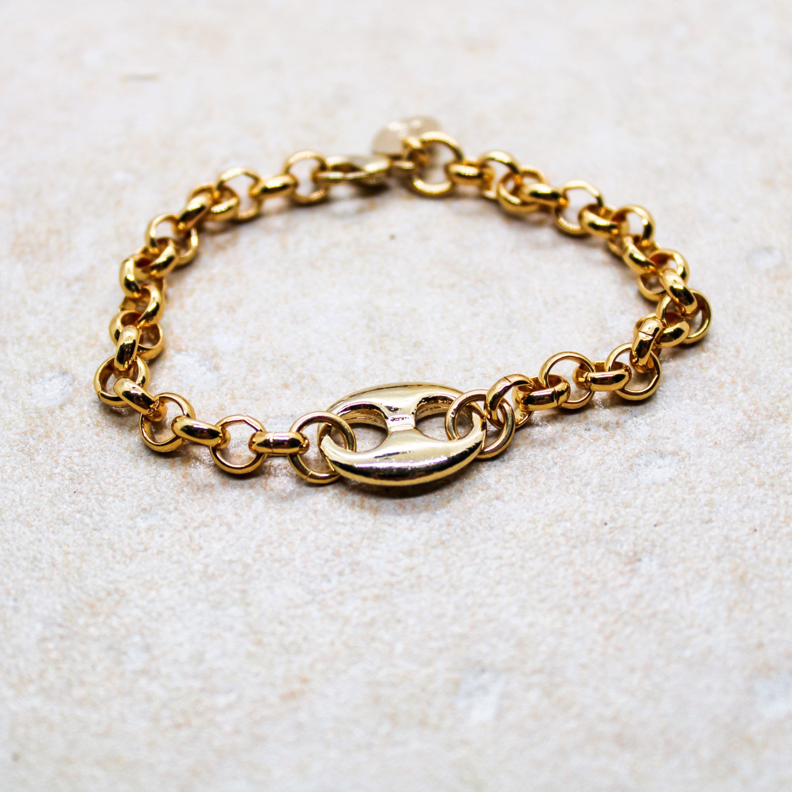Bracelet composé d’une chaîne en laiton doré à l’or fin 24K traitement cataphorèse et d’un connecteur maille grain de café de 1,8 cm de largeur en étain doré à l’or fin 24K 1 micron.