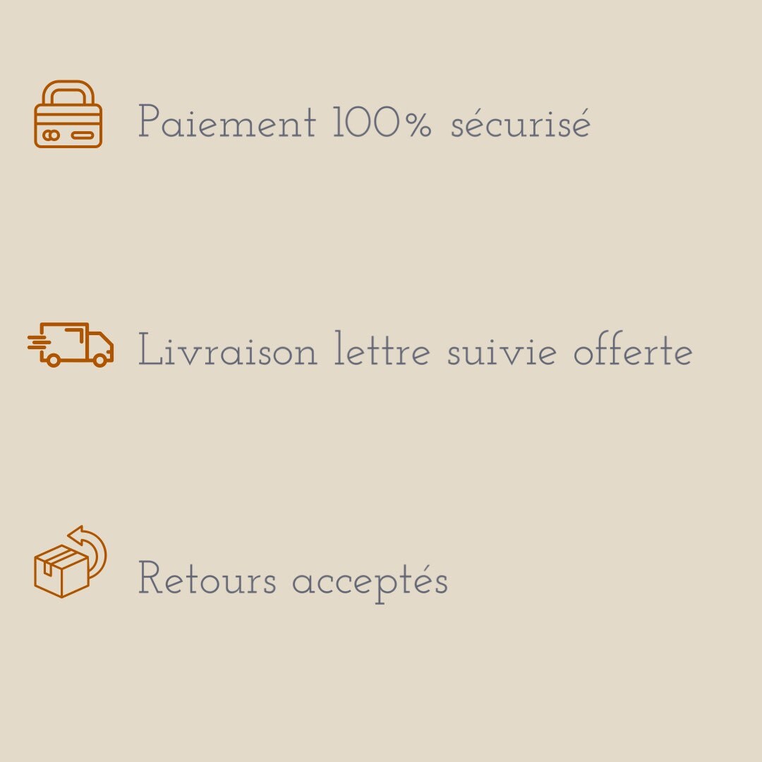 Article emballé dans une boîte en plastique recyclé ou un pochon en coton recyclé.