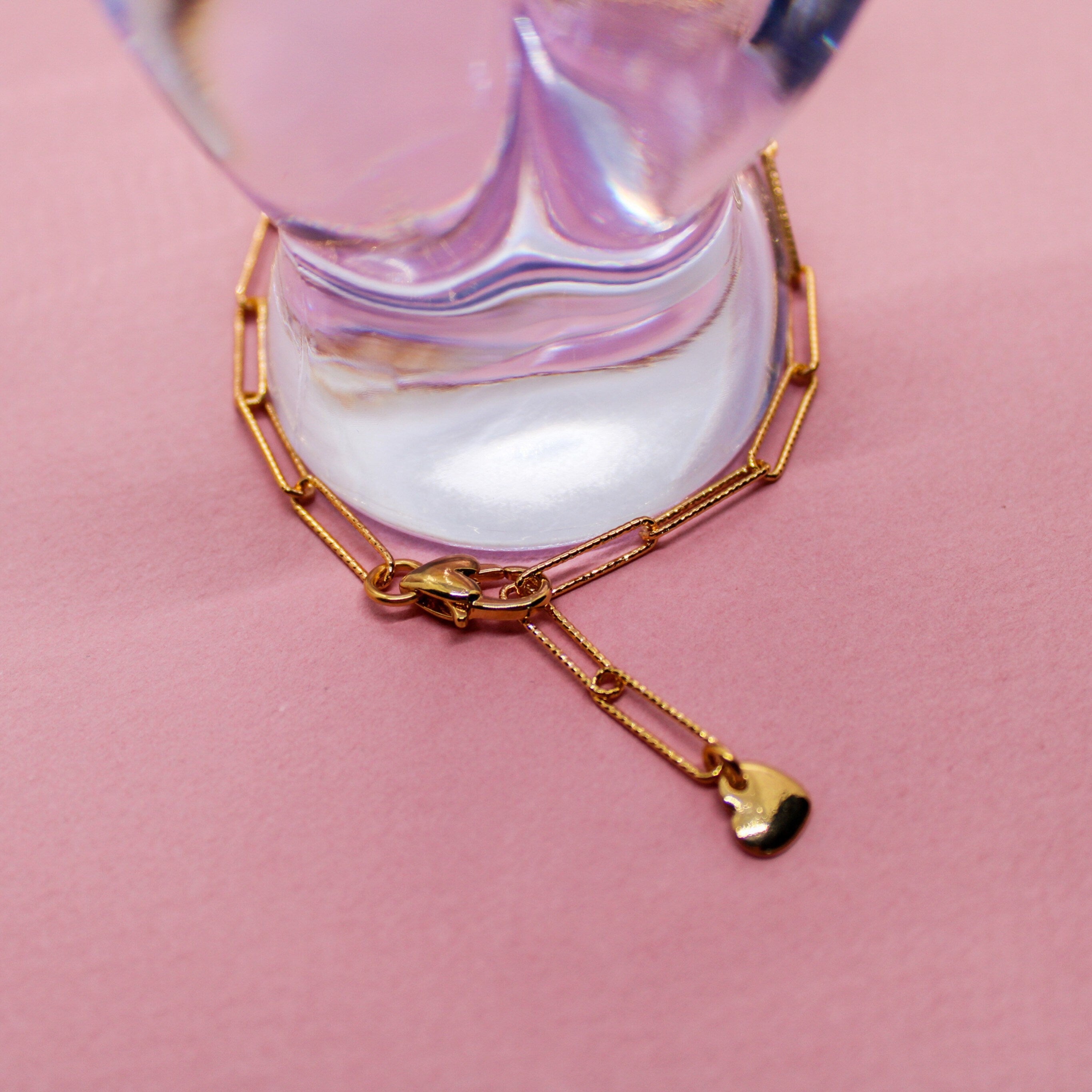 Bracelet composé d’une chaîne trombone diamantée de 25 cm en laiton doré à l’or fin 24K 1 micron, d’un fermoir fantaisie coeur d’1 cm de longueur environ en laiton doré à l’or fin 24K 1 micron et d’un petit coeur de 8 mm de longueur en étain doré à l’or fin 24K 1 micron.
