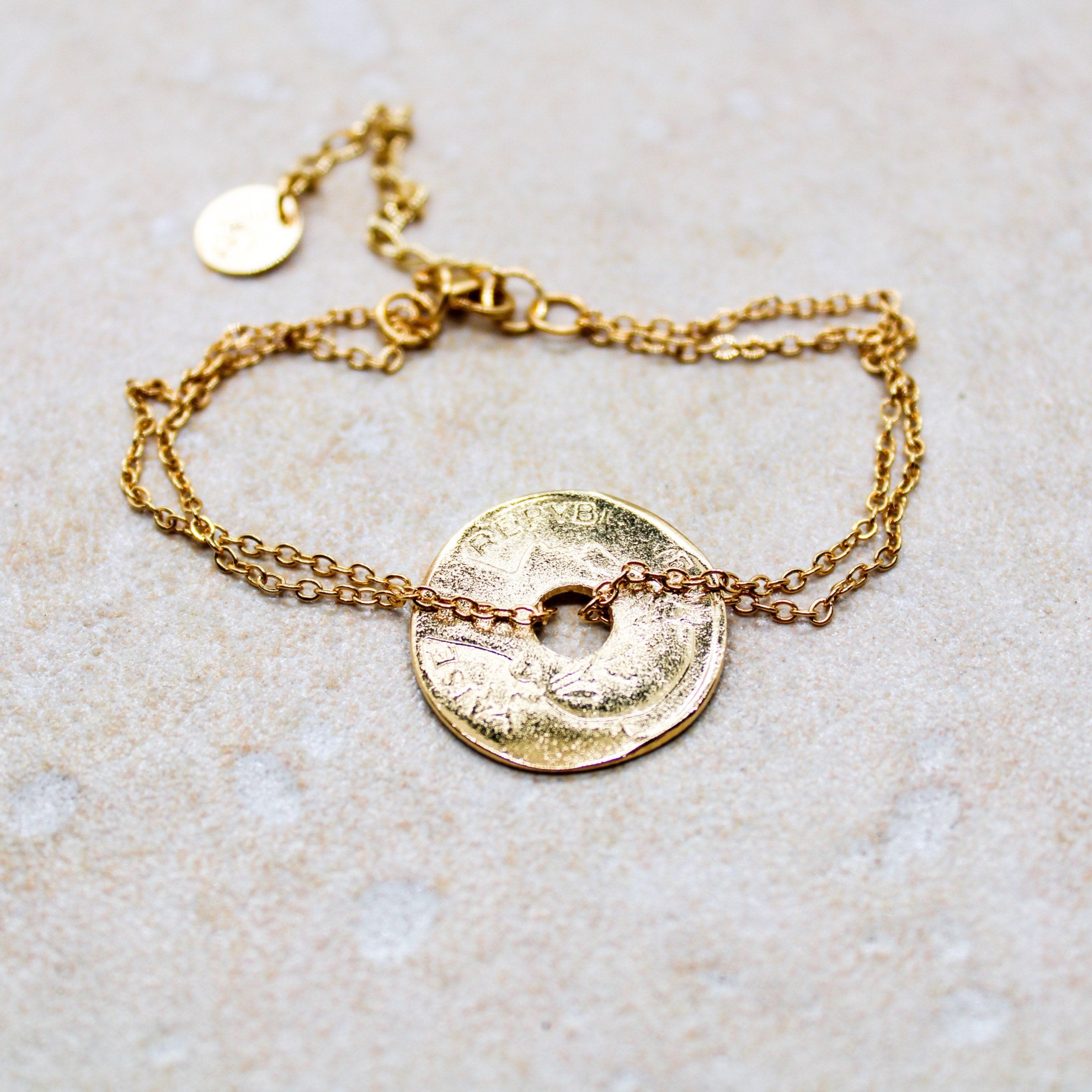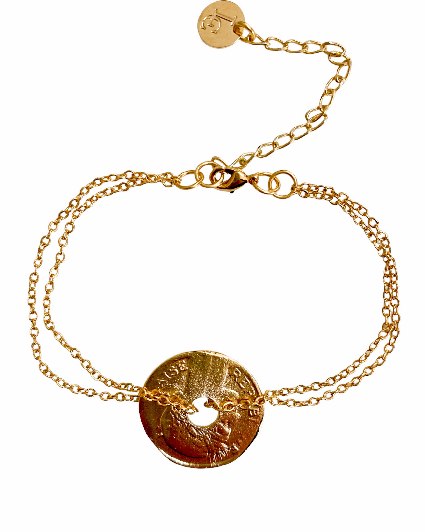 Bracelet composé d’une chaîne de 15 cm en laiton doré à l’or fin 24K 1 micron plus une chaînette d’extension de 5 cm ainsi que d’une pièce de monnaie en forme de donut de 2 cm de diamètre en étain doré à l’or fin 24K 1 micron.