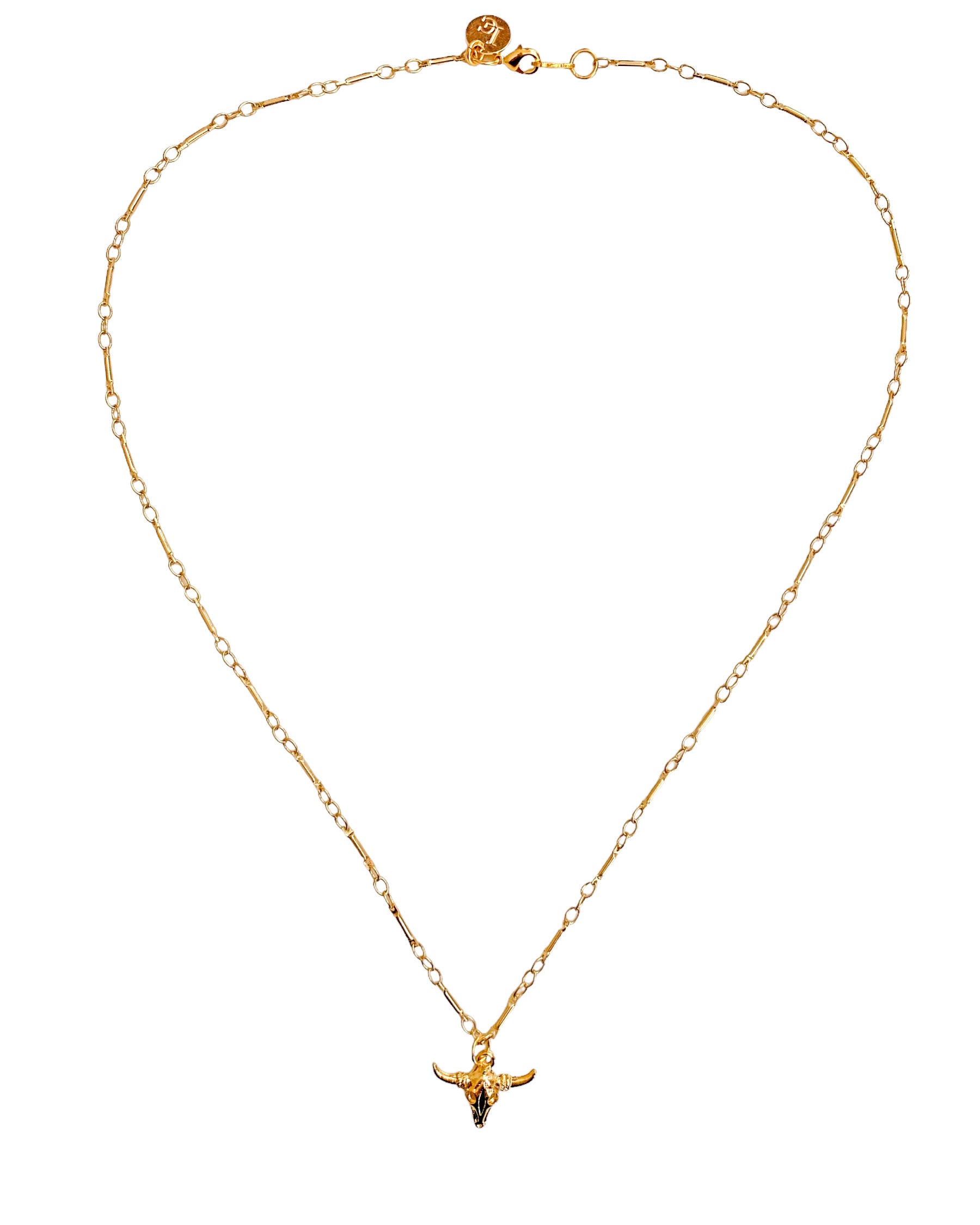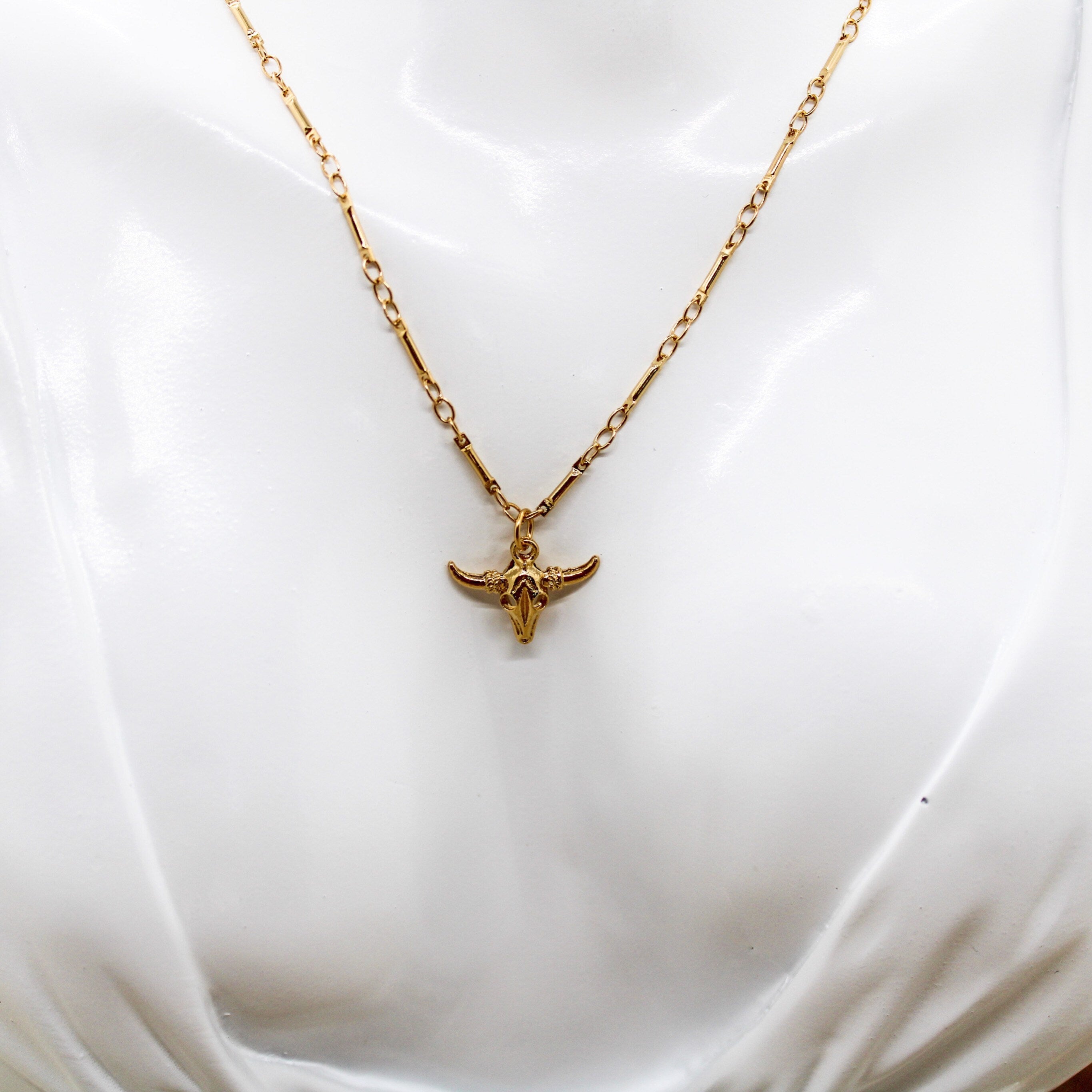 Collier composé d’une chaîne de 40 cm en laiton doré à l’or fin 24K revêtement cataphorèse et d’un pendentif buffle de 1,2 cm de longueur en étain doré à l’or fin 24K 1 micron.