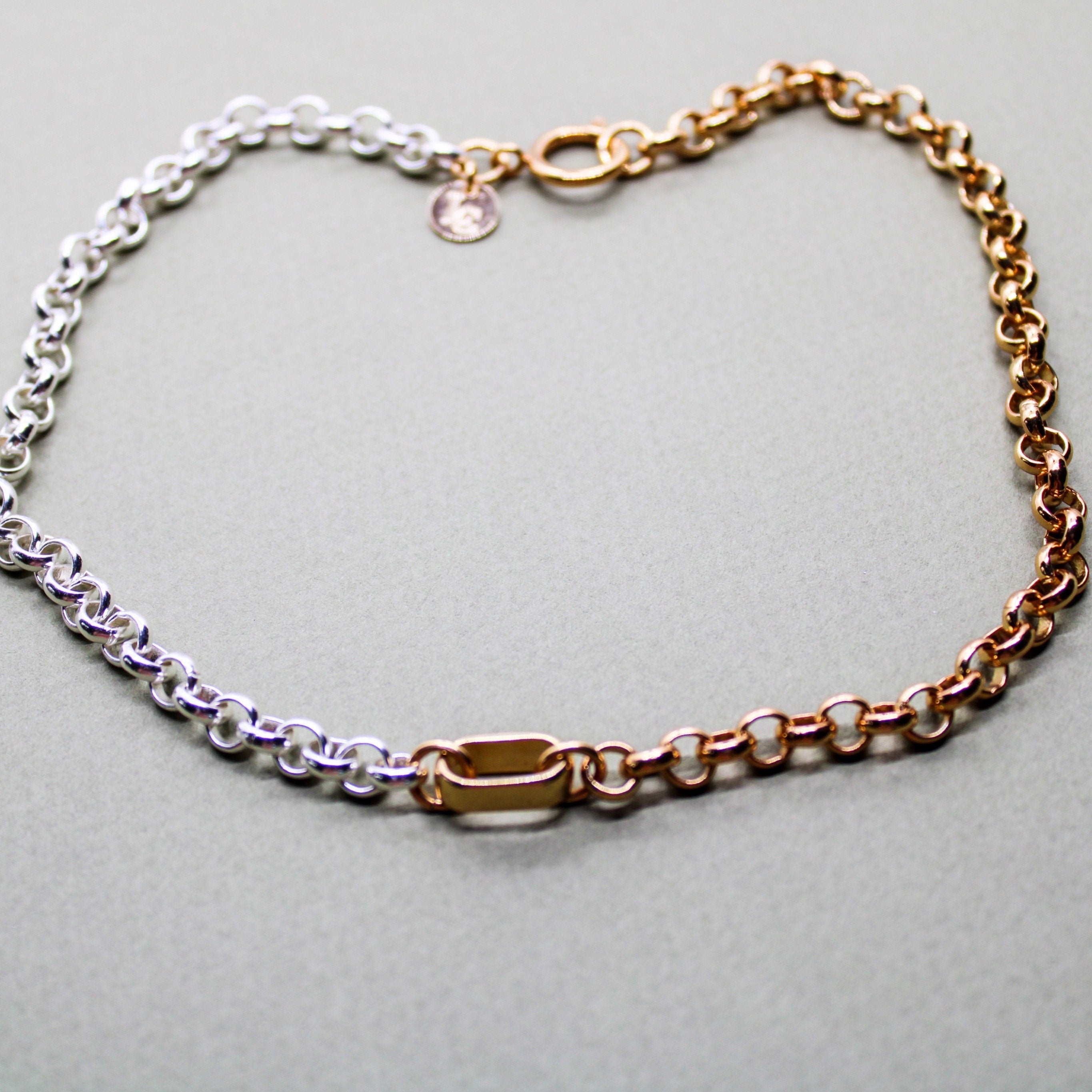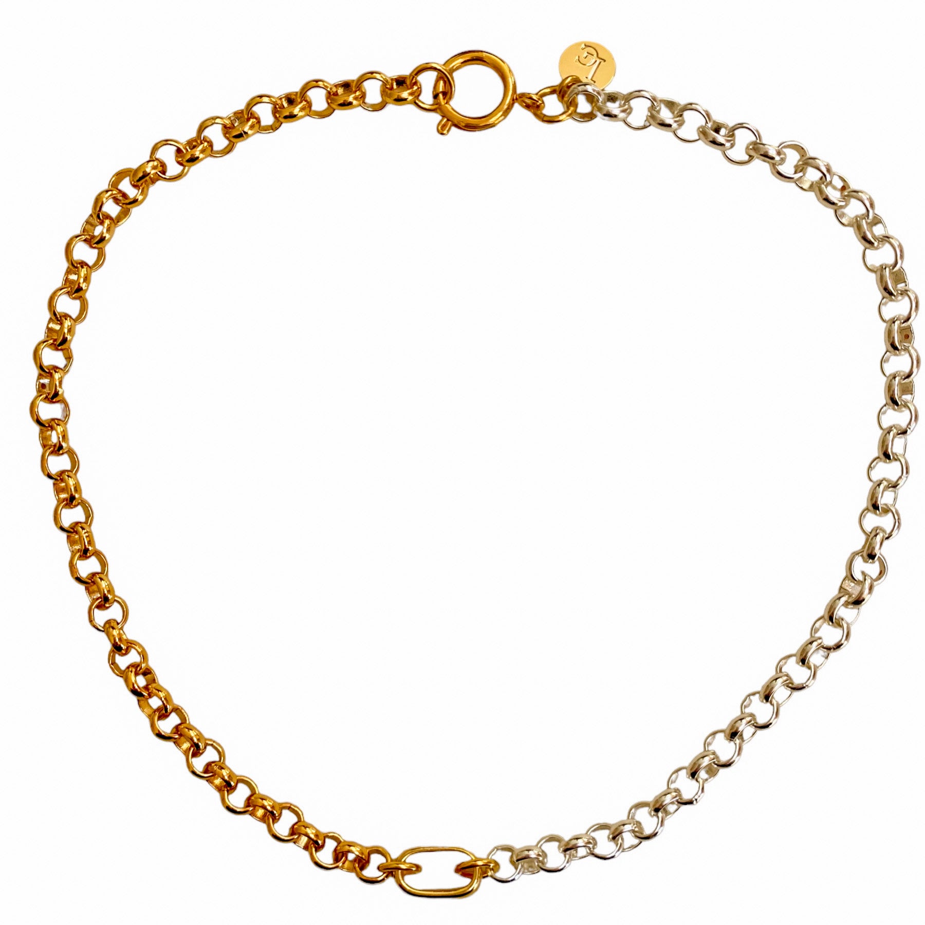 Collier composé d’une chaîne en laiton doré à l’or fin 24K revêtement cataphorèse de 17 cm, d’une chaîne en laiton argenté revêtement cataphorèse de 17 cm, d’un connecteur d’1 cm de longueur en étain doré à l’or fin 24K 1 micron et d’un fermoir d’1 cm de diamètre en laiton doré à l’or fin 24K 1 micron.