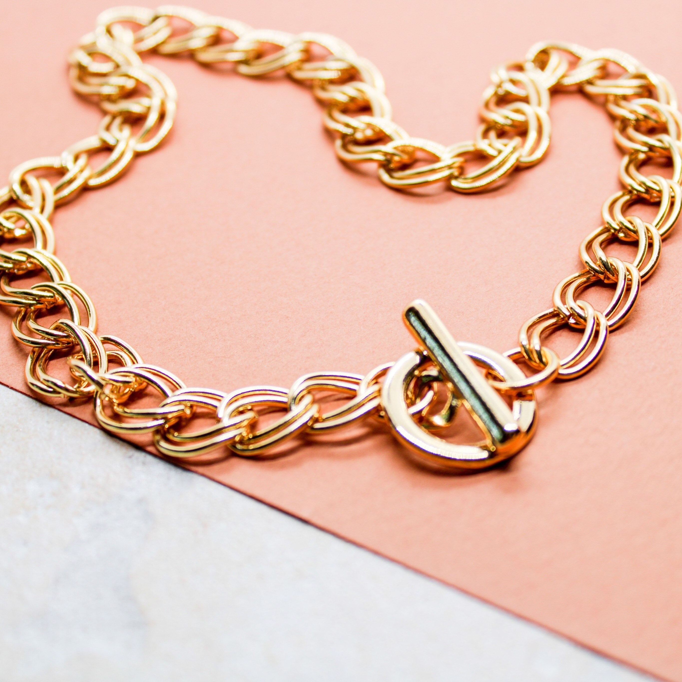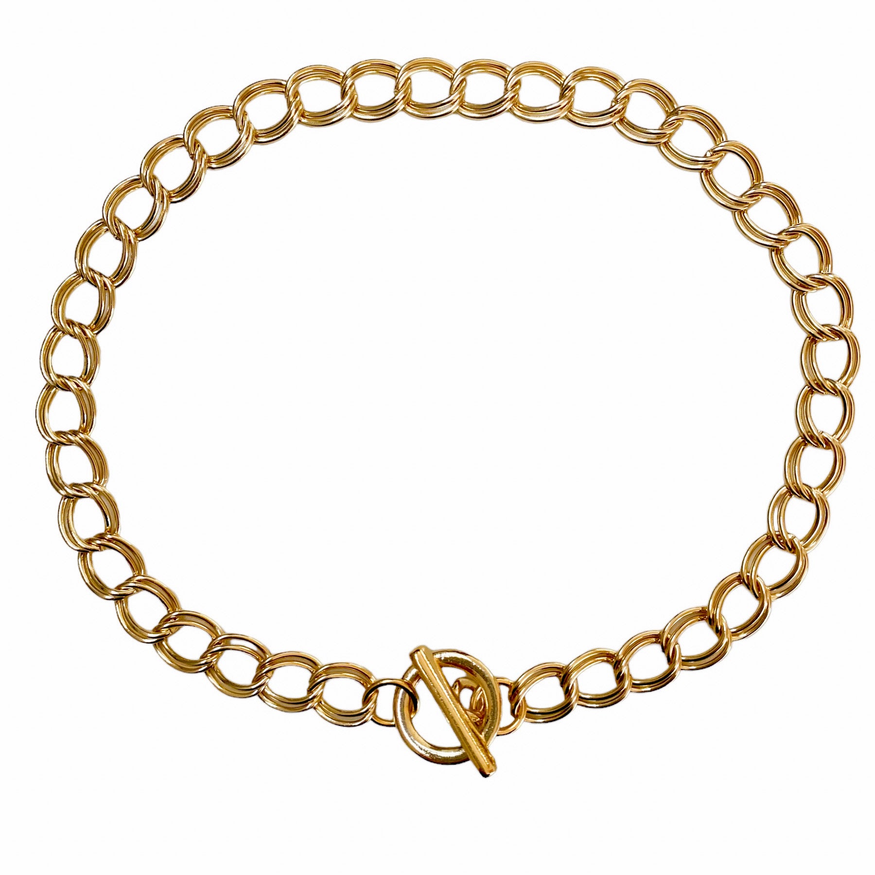 Ras de cou composé d’une chaîne en laiton doré à l’or fin 24K revêtement cataphorèse de 36 cm et d’un fermoir T de 2 cm de diamètre en étain doré à l’or fin 24K 1 micron.