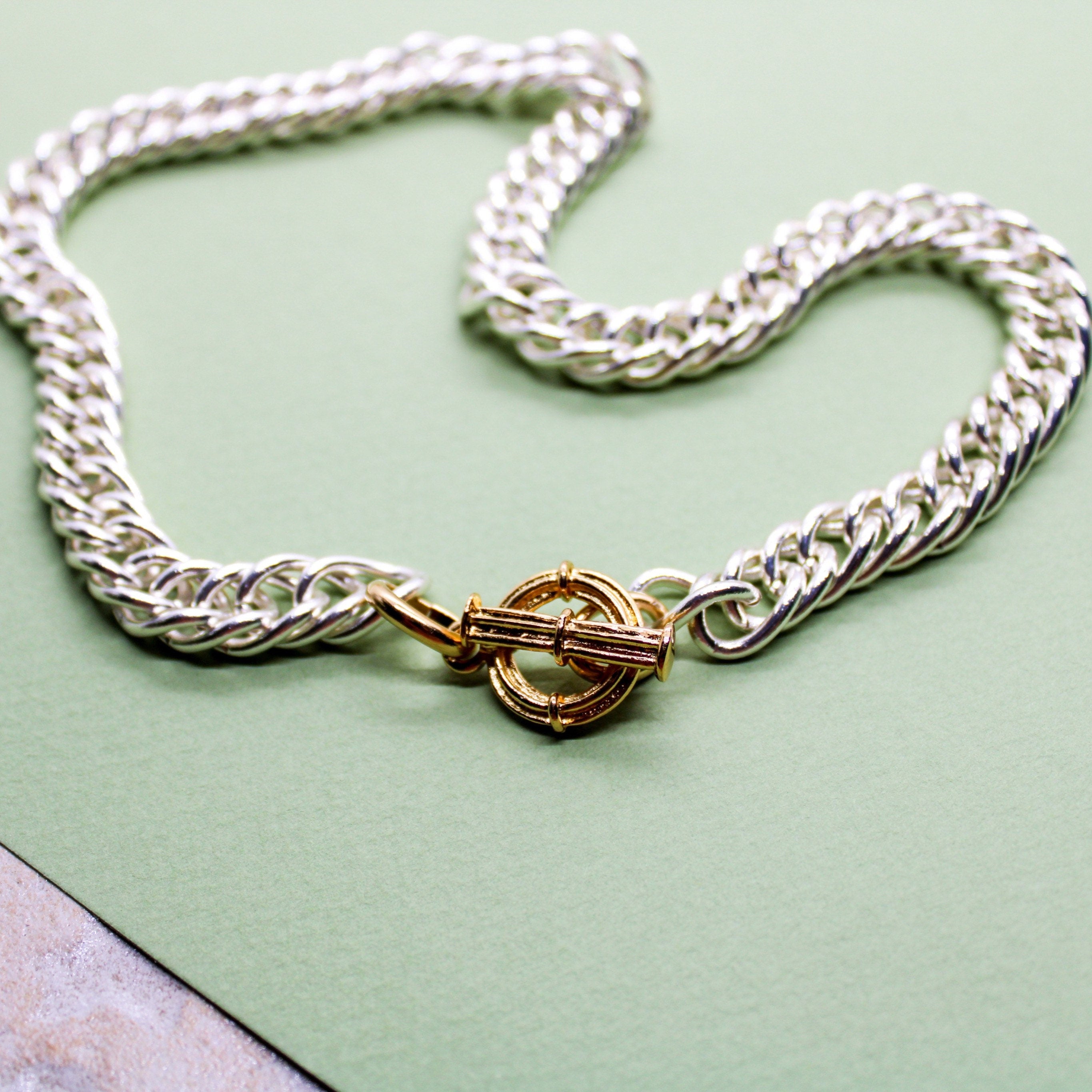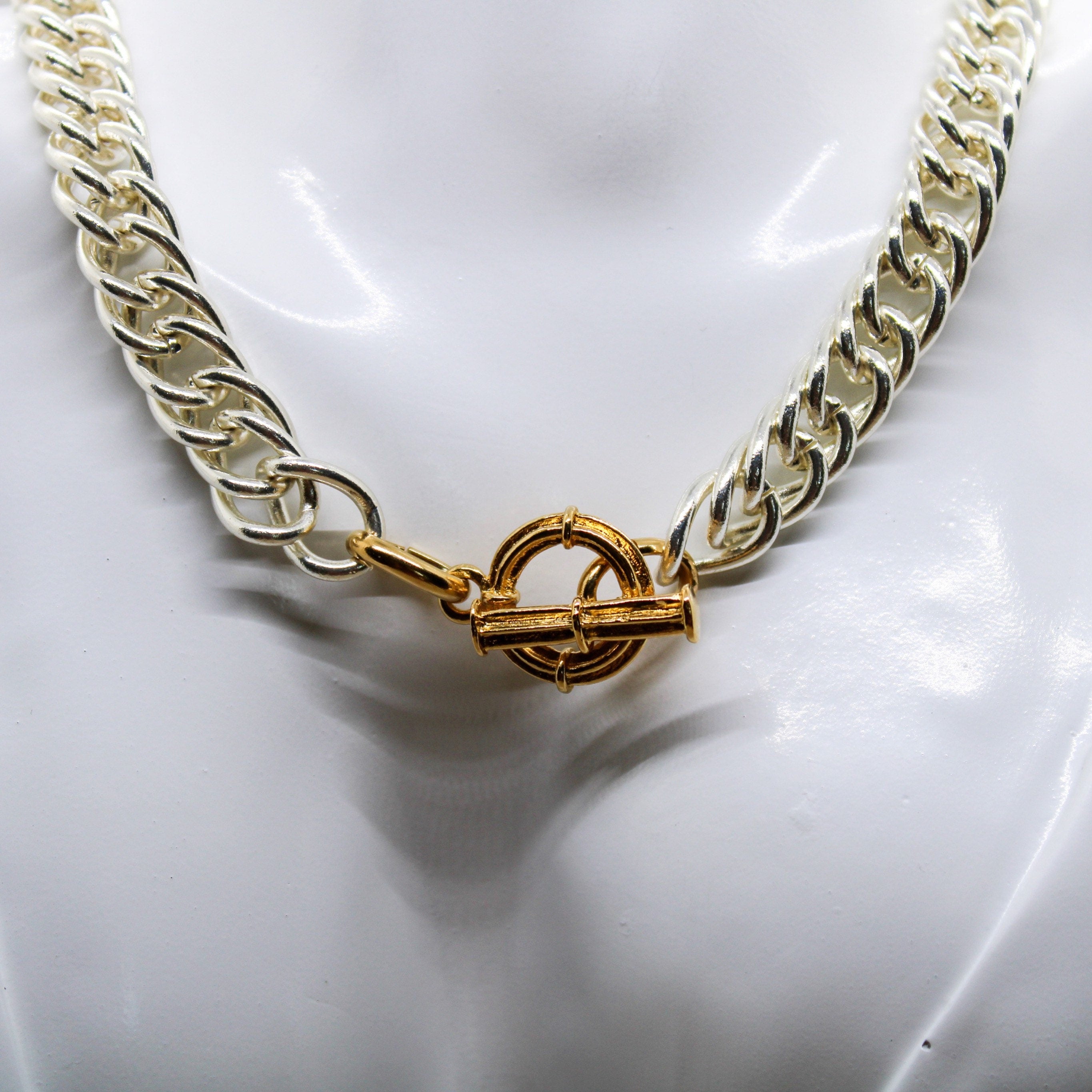 Collier composé d’une grosse chaîne gourmette de 38 cm de longueur en laiton argenté traitement cataphorèse et d’un fermoir T en étain doré à l’or fin 24K 1 micron.