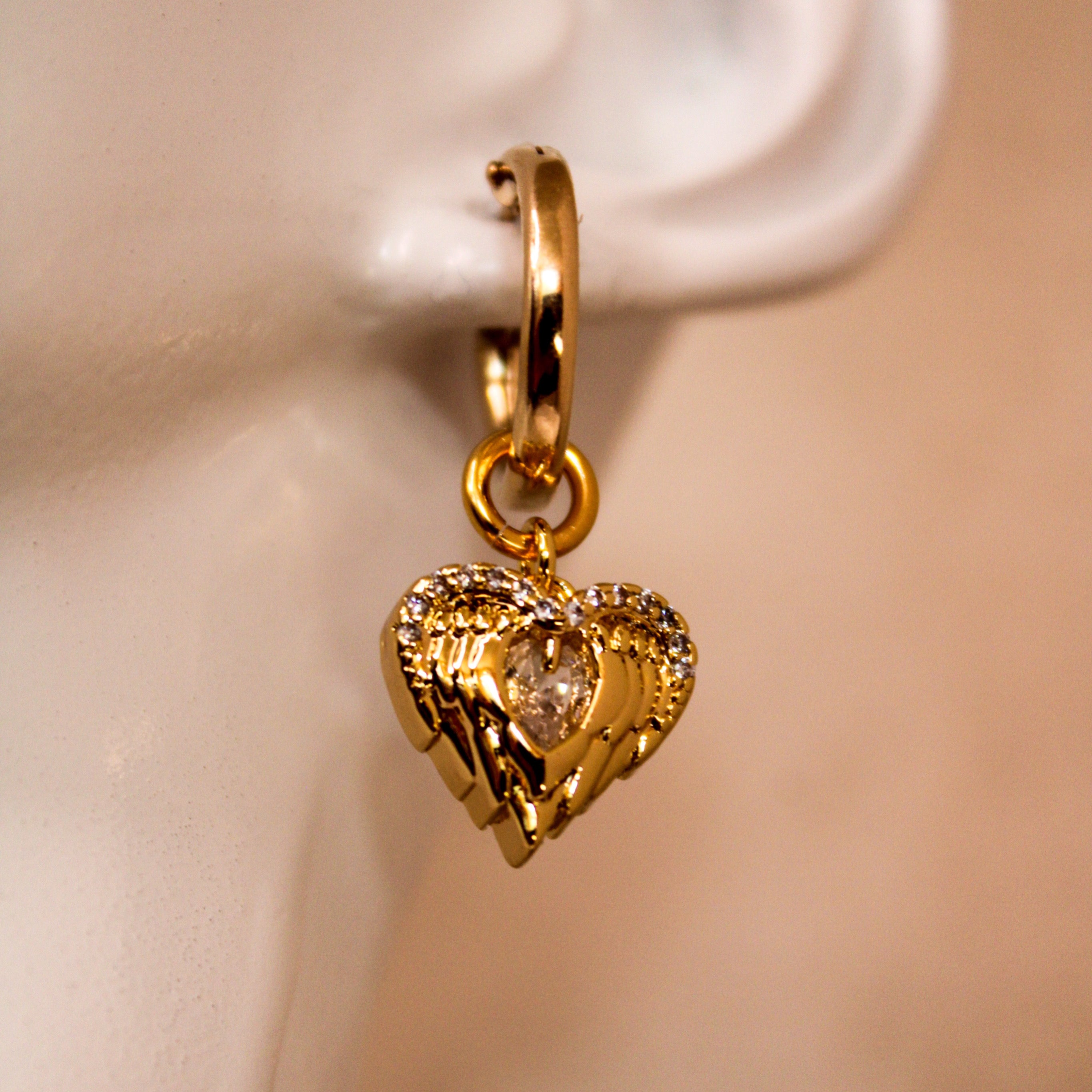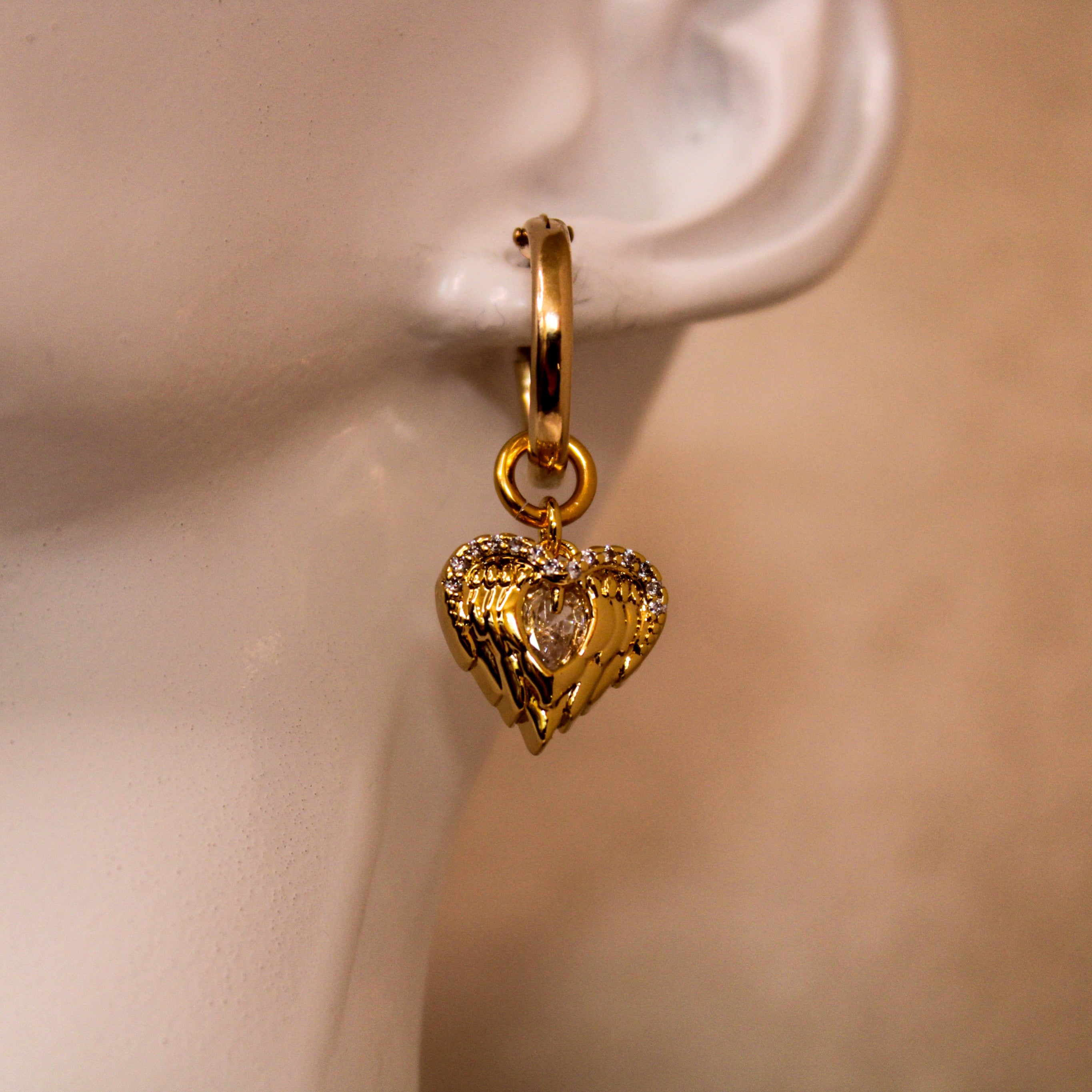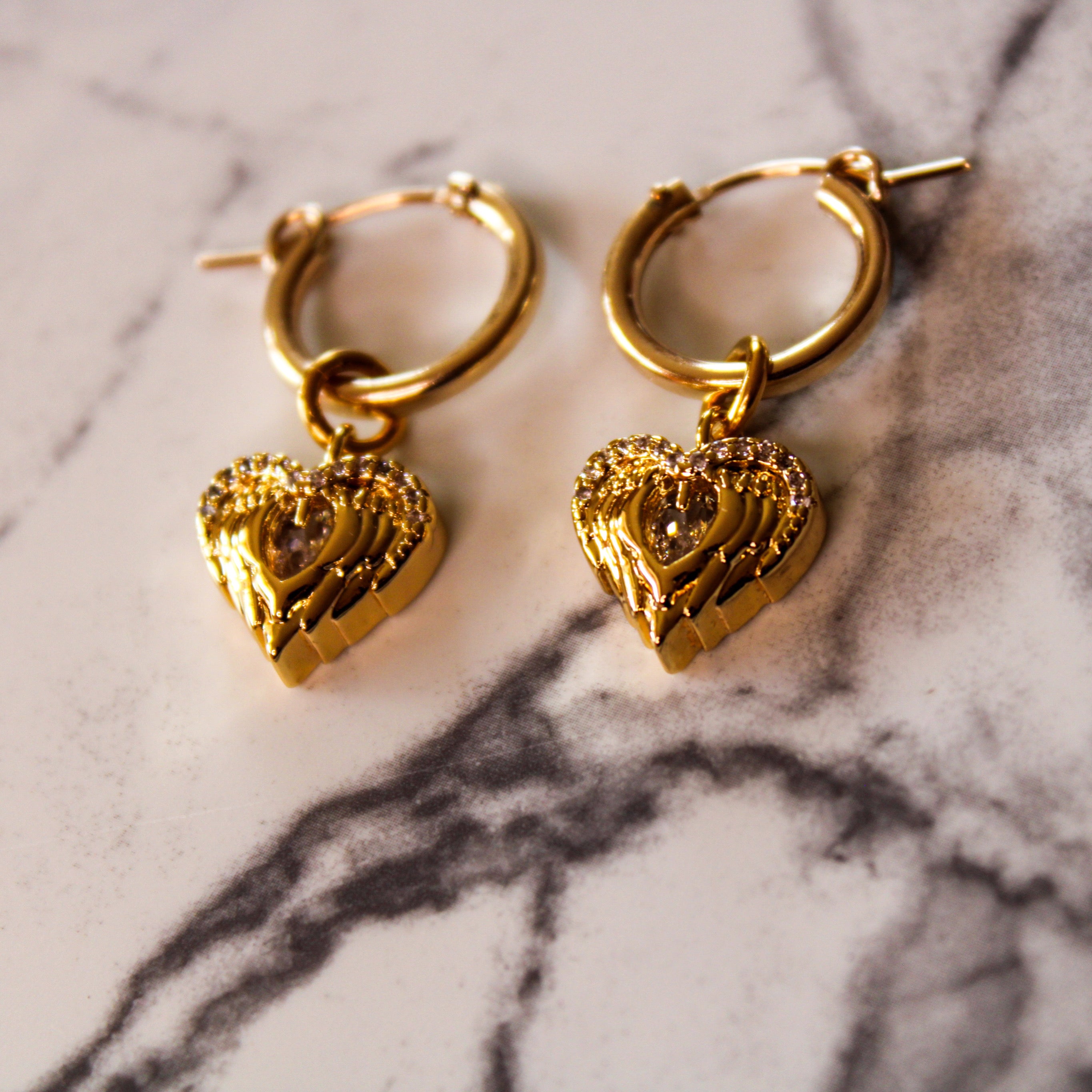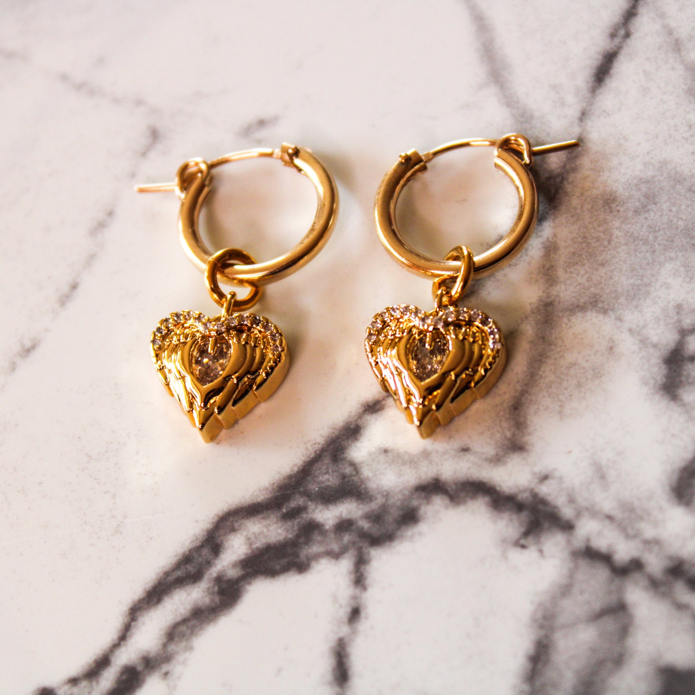 Créoles en gold filled et zircons cubiques composées d’un anneau d’1,5 cm de diamètre environ et d’ailes d’ange formant un coeur d’1,5 cm de longueur environ