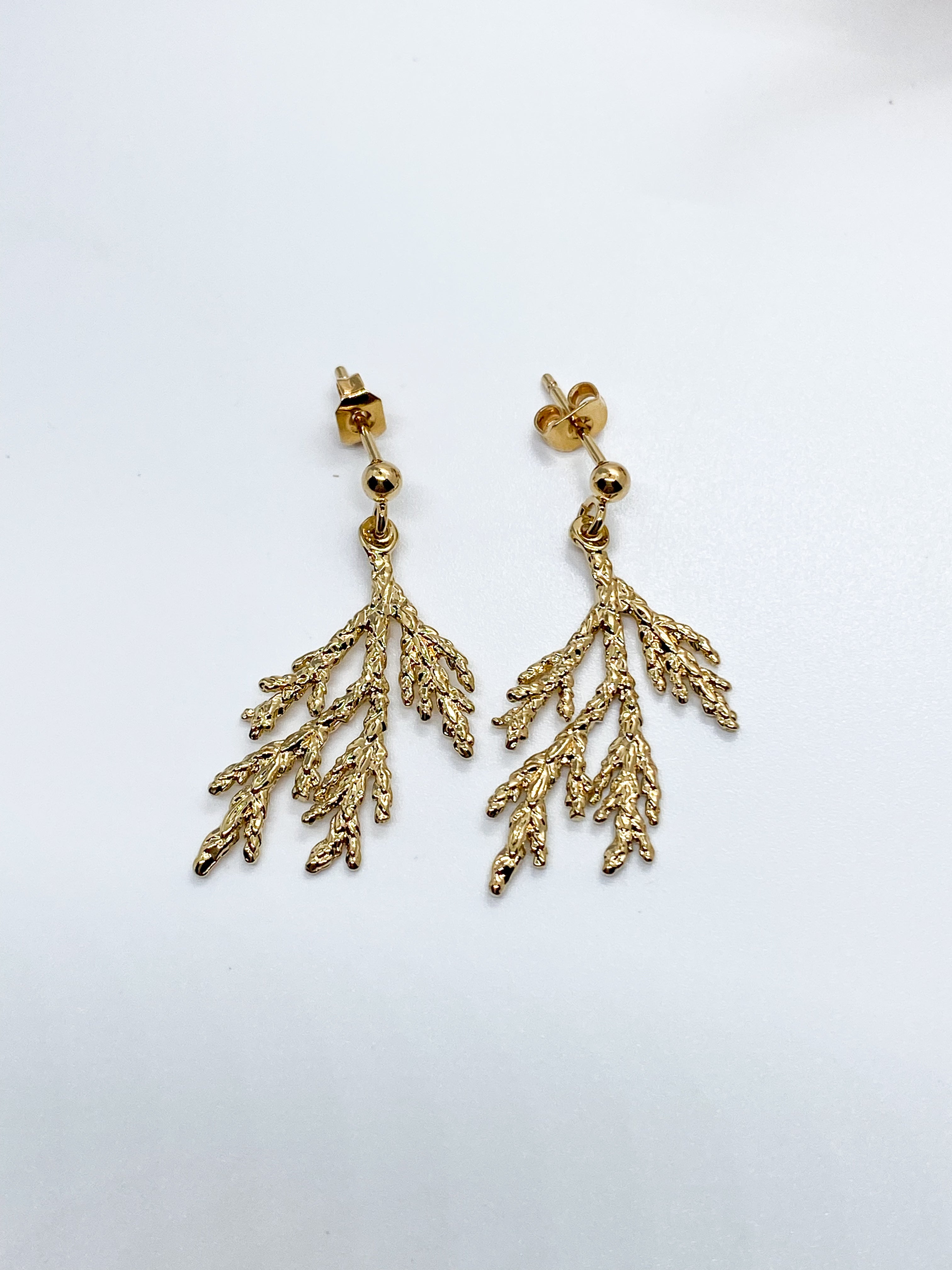 Boucles d’oreilles composées d’une puce en laiton doré à l’or fin 24K 1 micron et d’une breloque représentant du corail en étain doré à l’or fin 24K 1 micron d’une longueur de 3 cm.