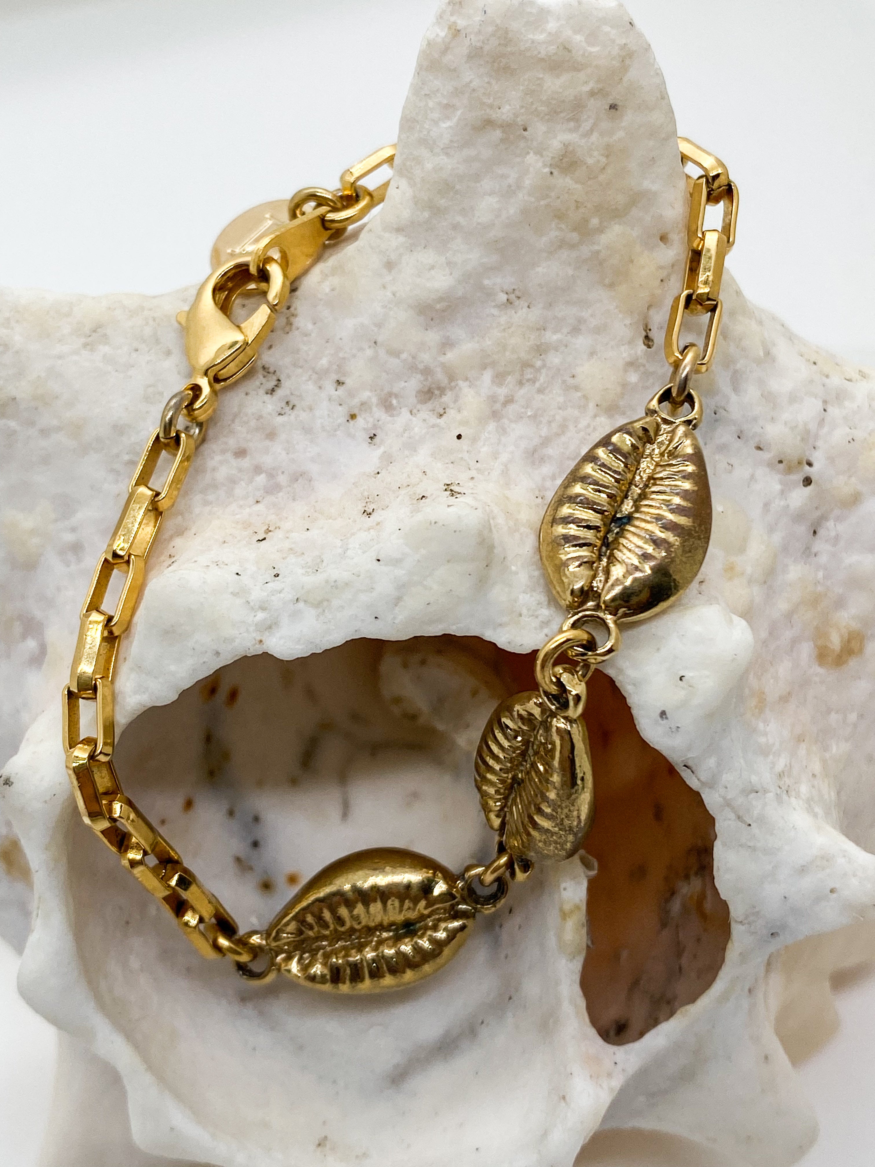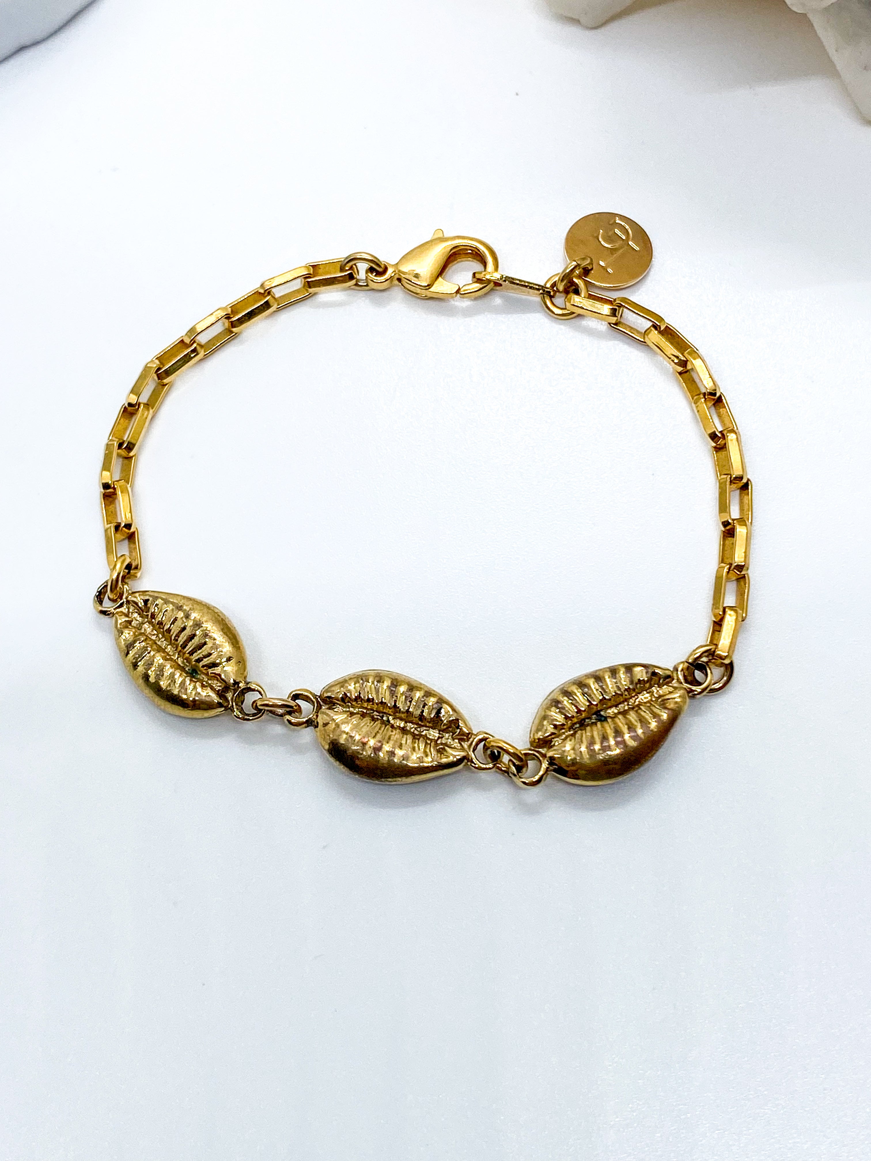 Bracelet composé d’une chaîne à maillons rectangulaires en laiton doré à l’or fin 24K 1 micron et de 3 coquillages cauris en étain doré à l’or fin 24K 1 micron.