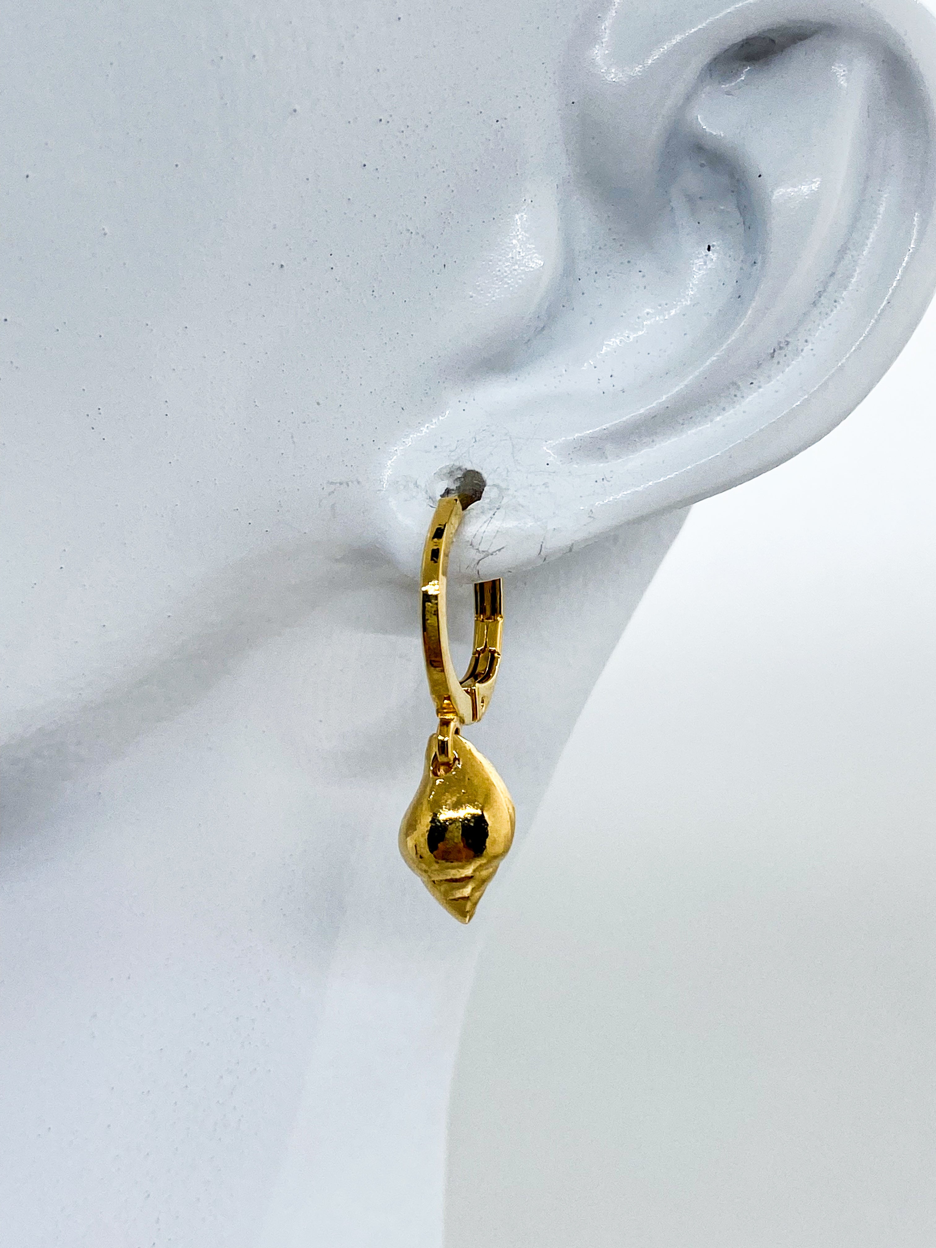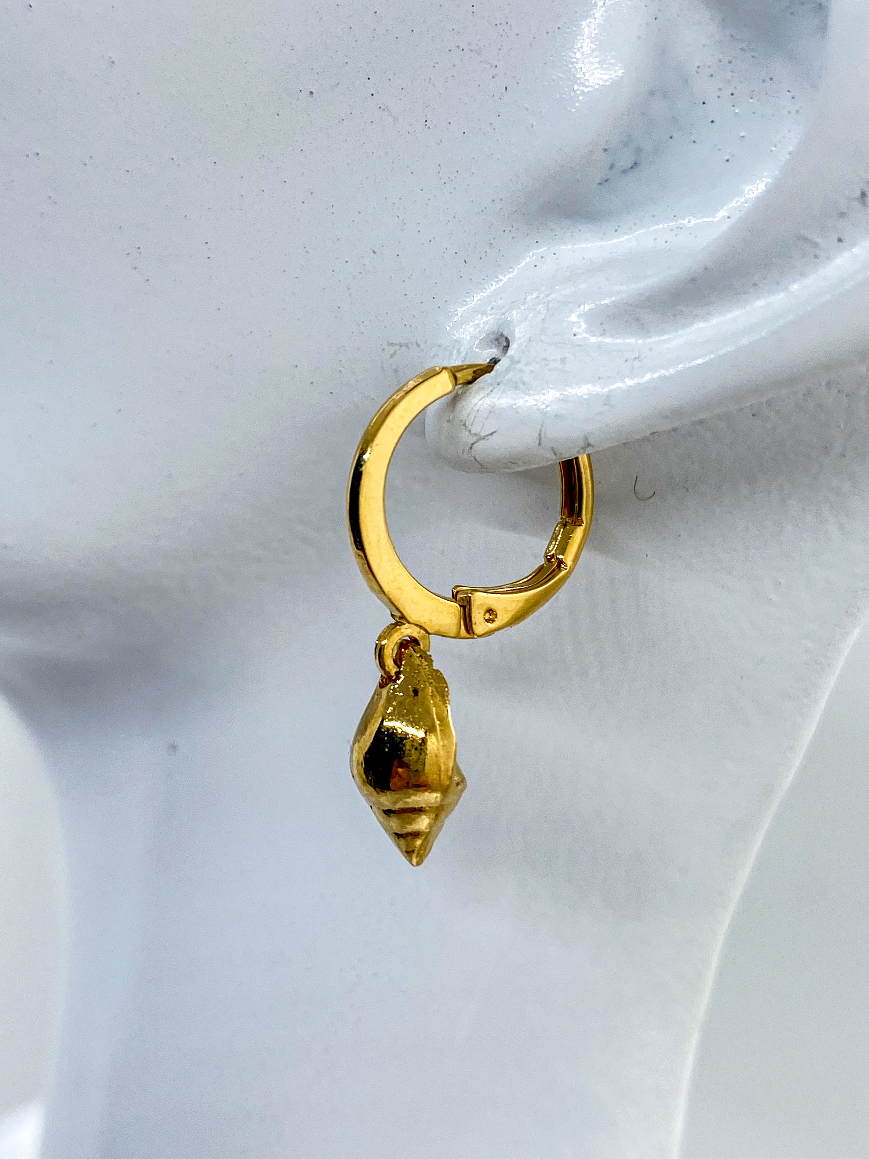 Créoles vendues par paire ou à l’unité composées d’un anneau d’1 cm de diamètre environ en laiton doré à l’or fin 24K 1 micron et d’une breloque représentant un coquillage d’1 cm de longueur en étain doré à l’or fin 24K 1 micron.