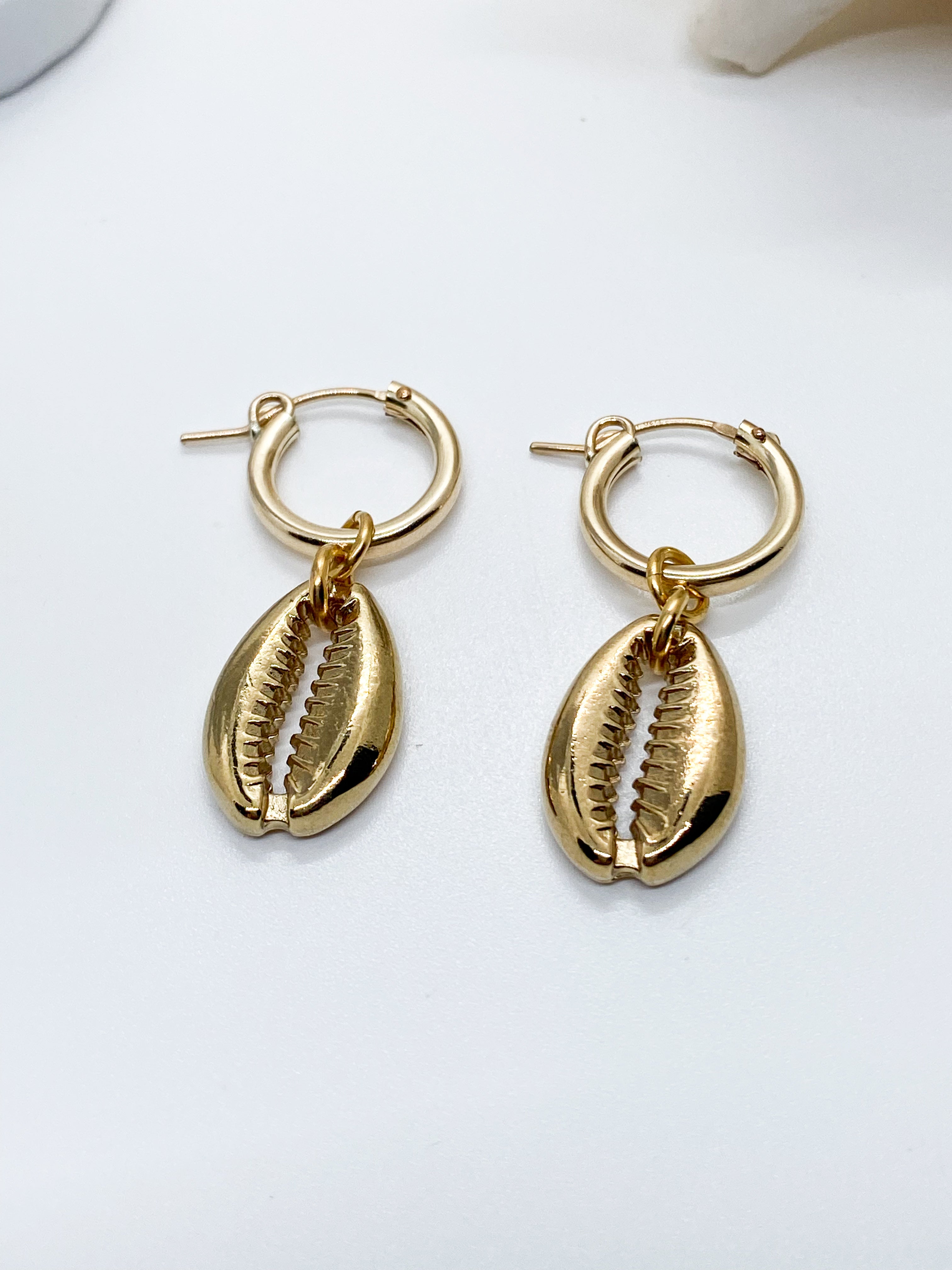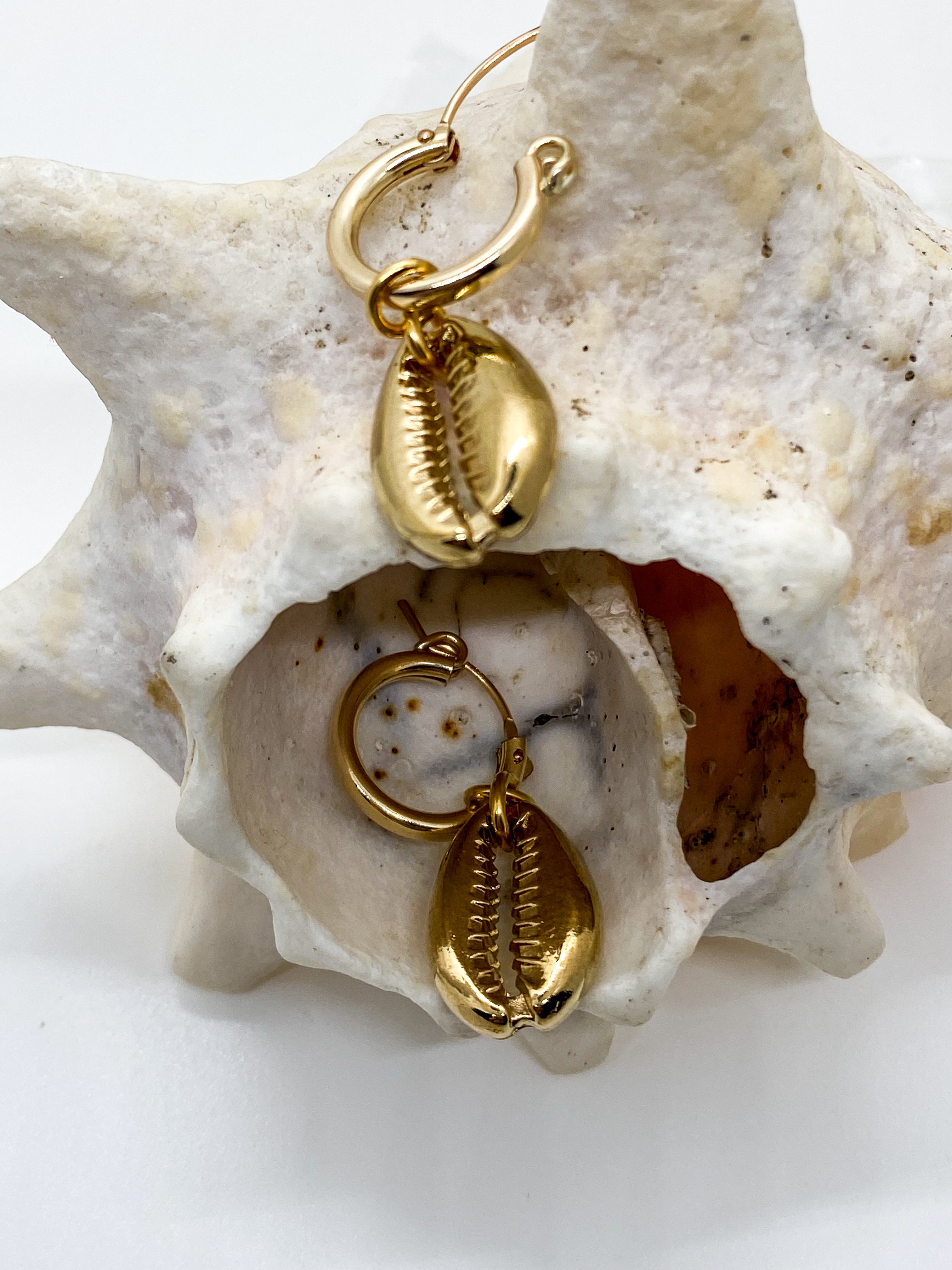 Créoles composées d’un anneau en gold filled de 1,5 cm de diamètre et d’un coquillage cauri en étain doré à l’or fin 24K 1 micron d’1 cm de longueur.