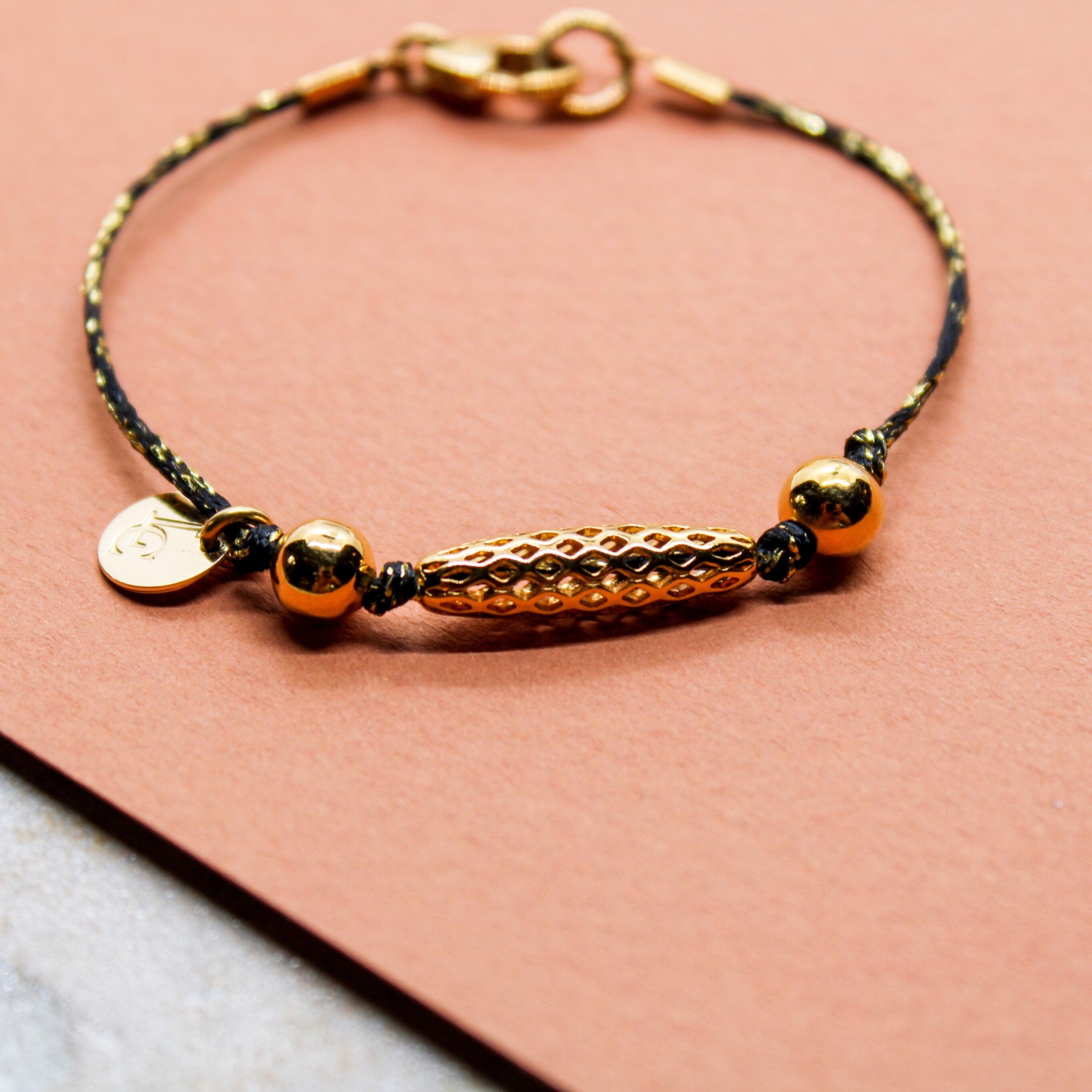 Bracelet composé d’un tube ajouré de 1,9 cm de longueur en laiton doré à l’or fin 24K 1 micron, de deux perles de 6 mm de diamètre en laiton doré à l’or fin 24K 1 micron et d’un fil en coton ciré noir et doré.