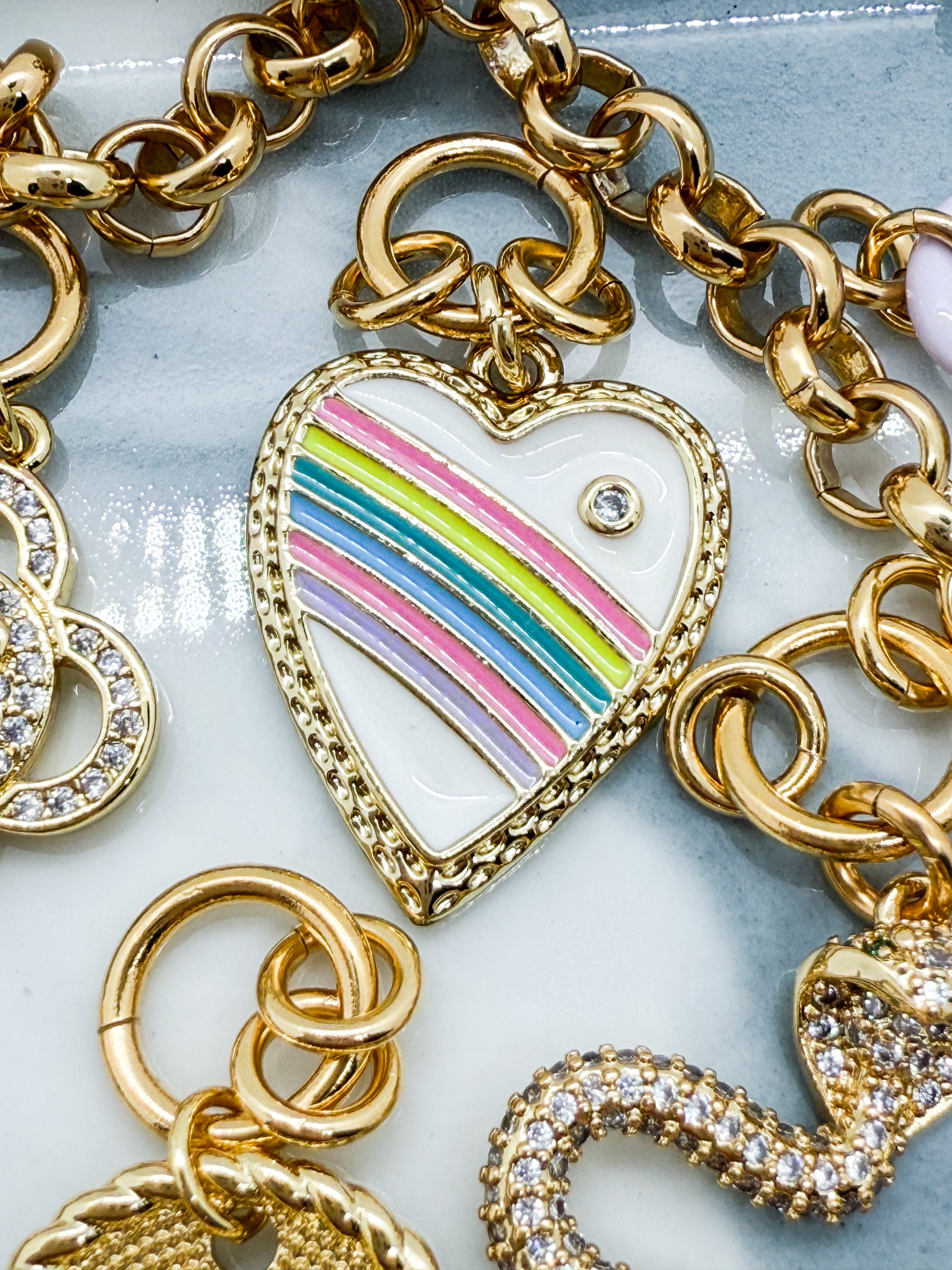 Charm en laiton doré, zircon cubique et émail. Anneaux en laiton doré à l’or fin 24K 1 micron.