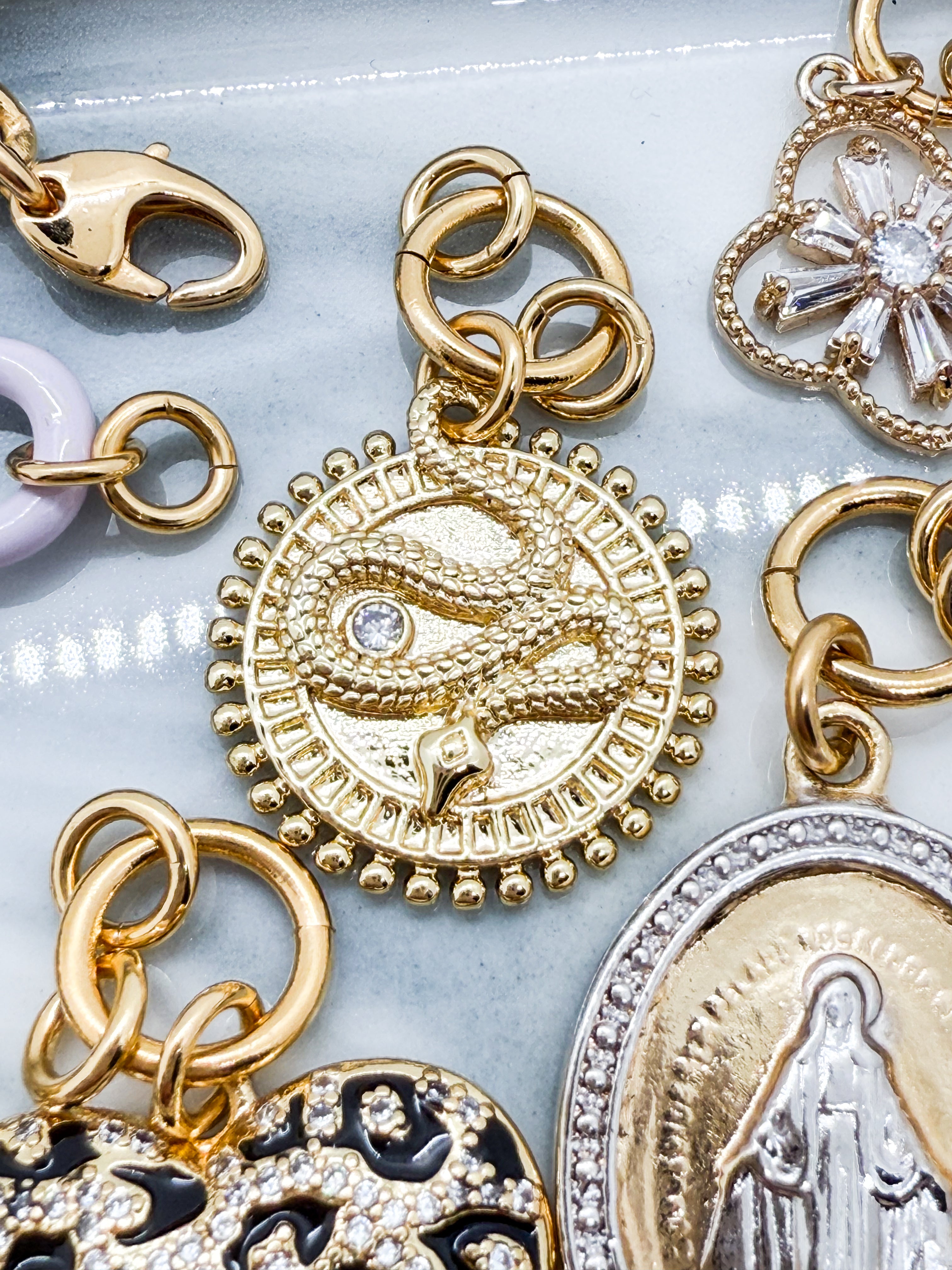 Charm en laiton doré et zircon cubique. Anneaux en laiton doré à l’or fin 24K 1 micron.