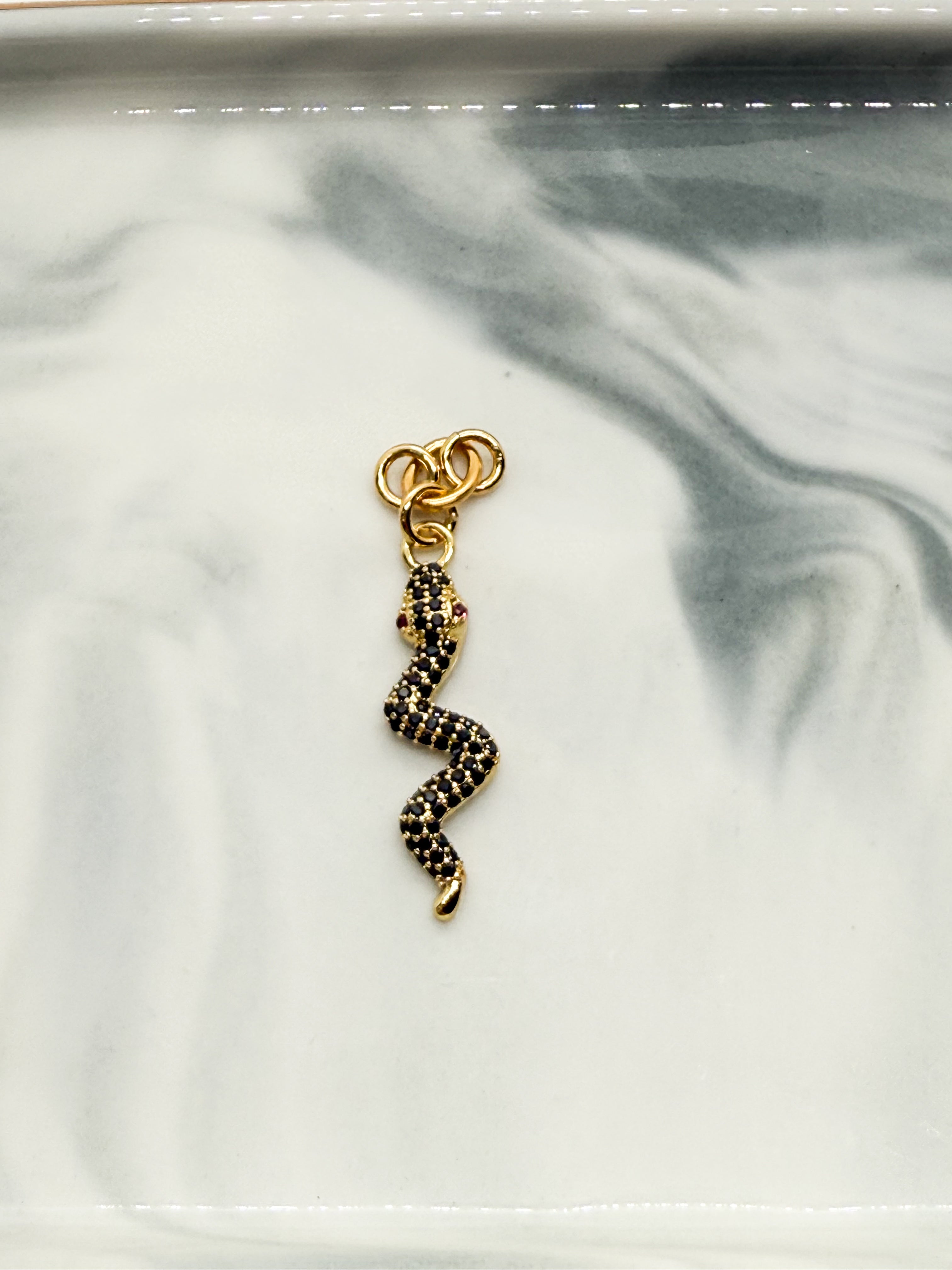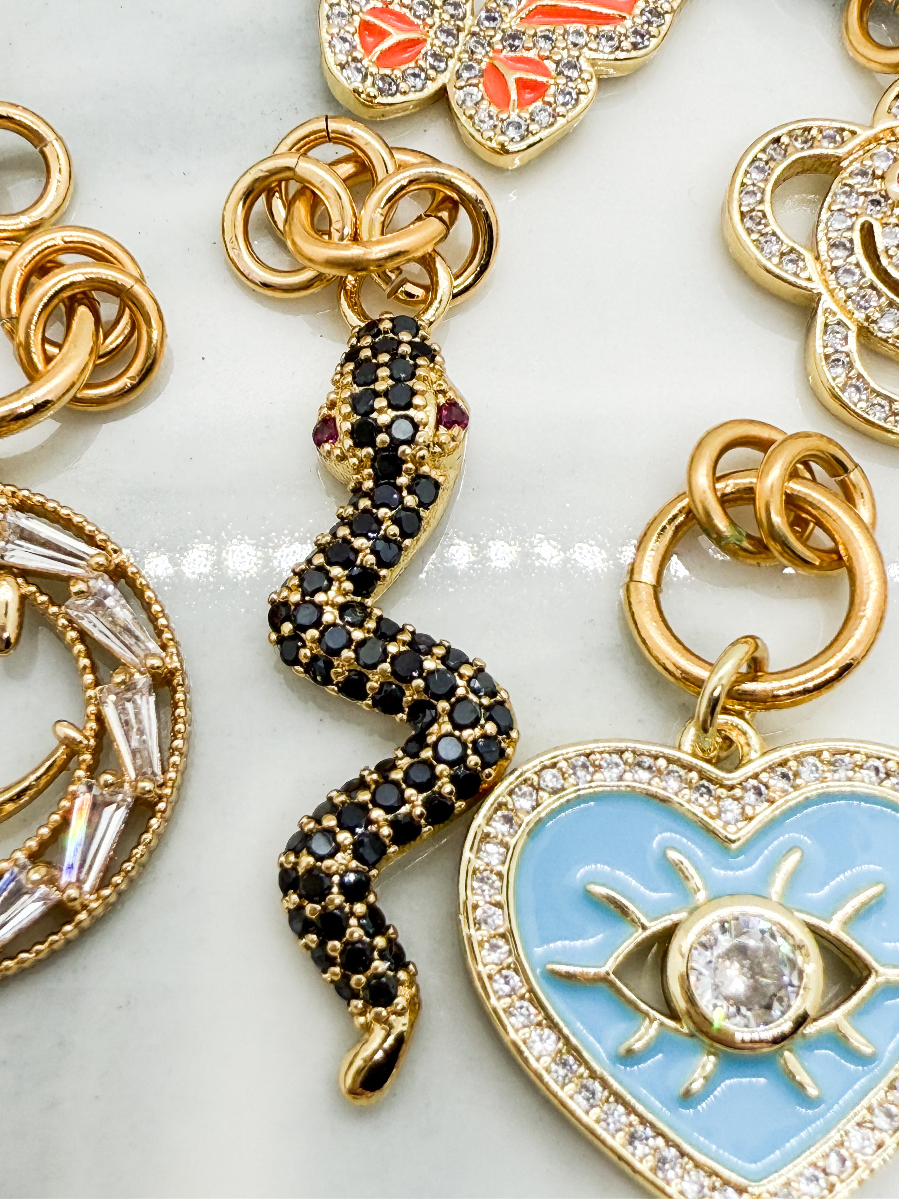 Charm en laiton doré et zircons cubiques noirs et rouge. Anneaux en laiton doré à l’or fin 24K 1 micron